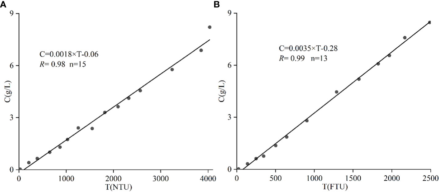 Calibration curves used to convert optical turbidity (T; NTU) recorded by OBSs to suspended sediment concentration (SSC) (C; g/L). (A) calibration curves for the TF site; (B) calibration curves for the SM site.