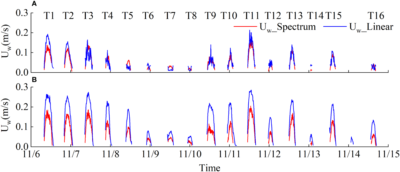 Time-series of (A) wave orbital velocity calculated by different methods at the SM site (B) wave orbital velocity calculated by different methods at the TF site.