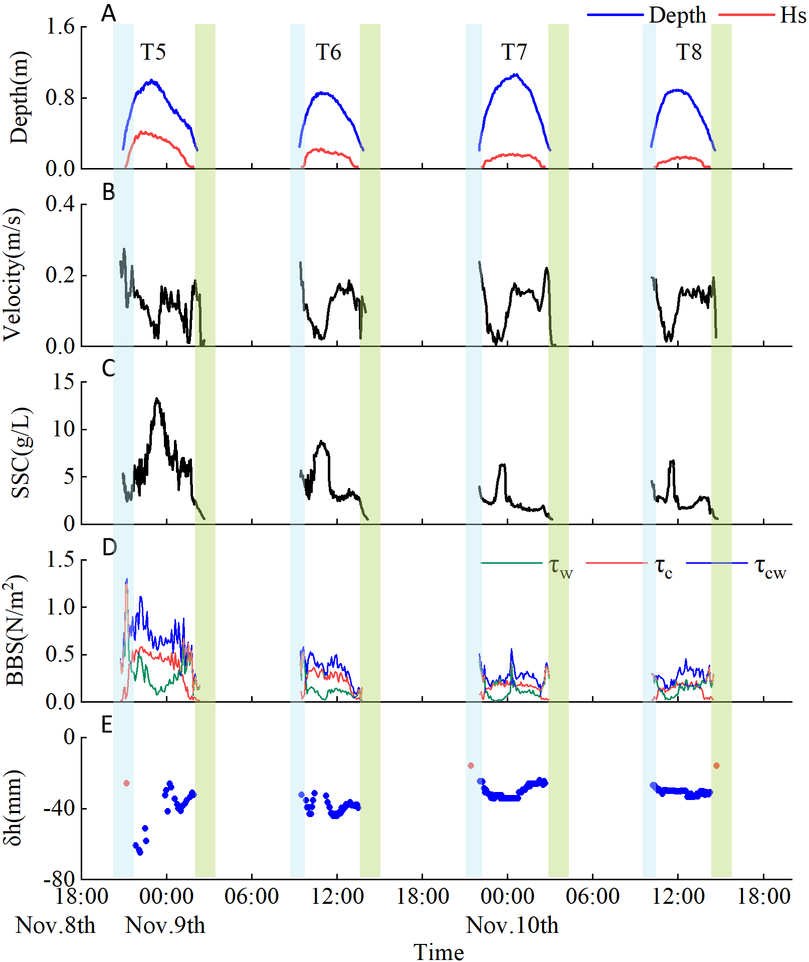 Time series of (A) water depth, (B) bed shear stress due to currents ( ); (C) bed shear stress due to waves ( ); (D) bed shear stress due to currents and waves ( ); (E) suspended sediment concentration (SSC); (F) bed level changes (positive value represents deposition, the negative value represents erosion, and the single point represents the value of each burst.