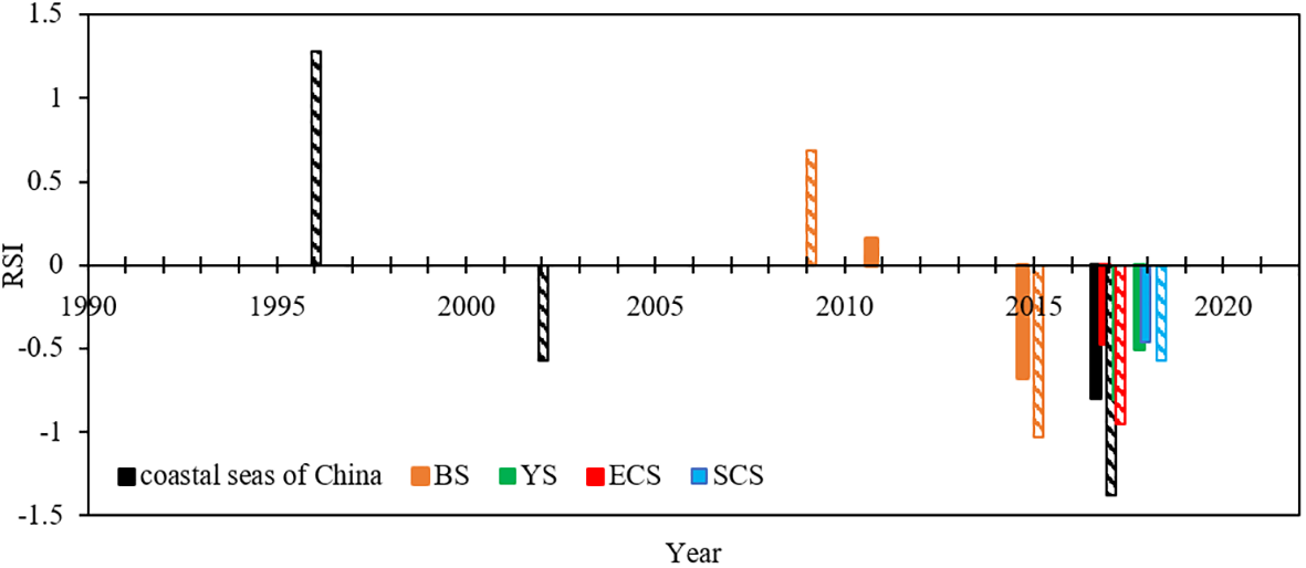 The Sequential T–test Analysis of Regime Shift (STARS) algorithm developed by Rodionov (2004) was used to examine trends in the integrity and connectivity of each time series, and to identify the turning points and thresholds, which represent the transition of different level of eutrophication or the pollution. STARS algorithm mainly determined the mutation point by the Regime Shift Index (RSI) calculated through the selected cut–off length L and the preset confidence p–value (as detailed in Rodionov and Overland, 2005). The larger the RSI value, the higher the confidence. The specific method applied was that of Xie et al. (2021). Considering the development plan made by the Chinese government per five years, the L value in this study was set as 5, and the p value was selected as 0.1.