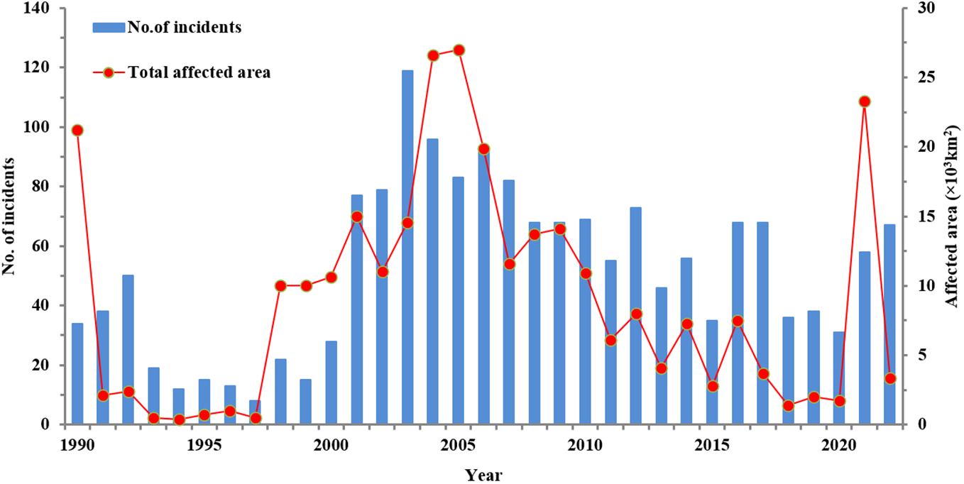 Annual variations of red tide incidents and total affected area in the coastal seas of China over the last three decades.