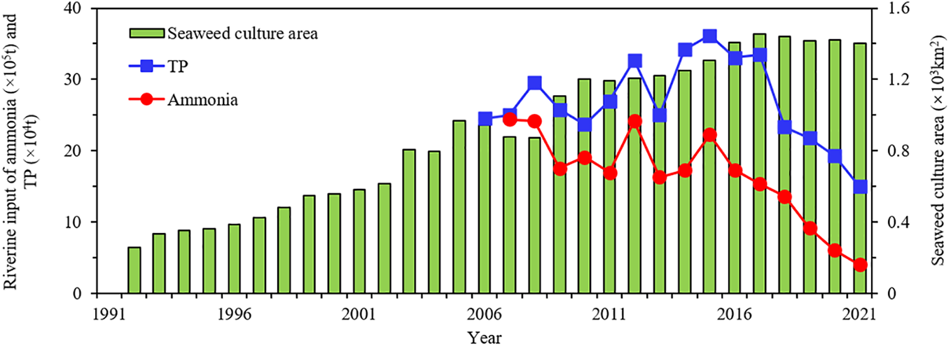 Variations in riverine inputs of TP and ammonia, and area of seaweed farming in the coastal seas of China over the last three decades.