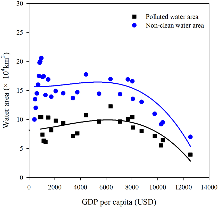 The relationship between GDP and water quality in the coastal seas of China (the solid lines are quadratic fitting curves).