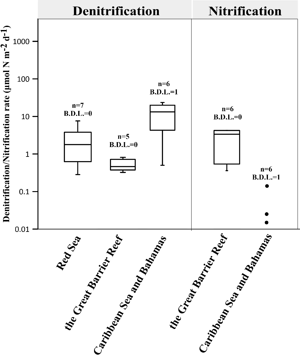 Figure 2 presents the denitrification and nitrification rates of coral holobionts. The median rates for the 4 boxes (Denitrification: Red sea, the Great Barrier Reef and Caribbean Sea and Bahamas; Nitrification: the Great Barrier Reef) are 1.8, 13.3, 0.4 and 3.4 μmol N m-2 d-1 respectively. Although the range of these rates is smaller than that of N2 fixation, they still show differ by orders of magnitude, possibly due to coral heterogeneity, regional differences and variations in denitrification rate measurement protocols (Table S2).