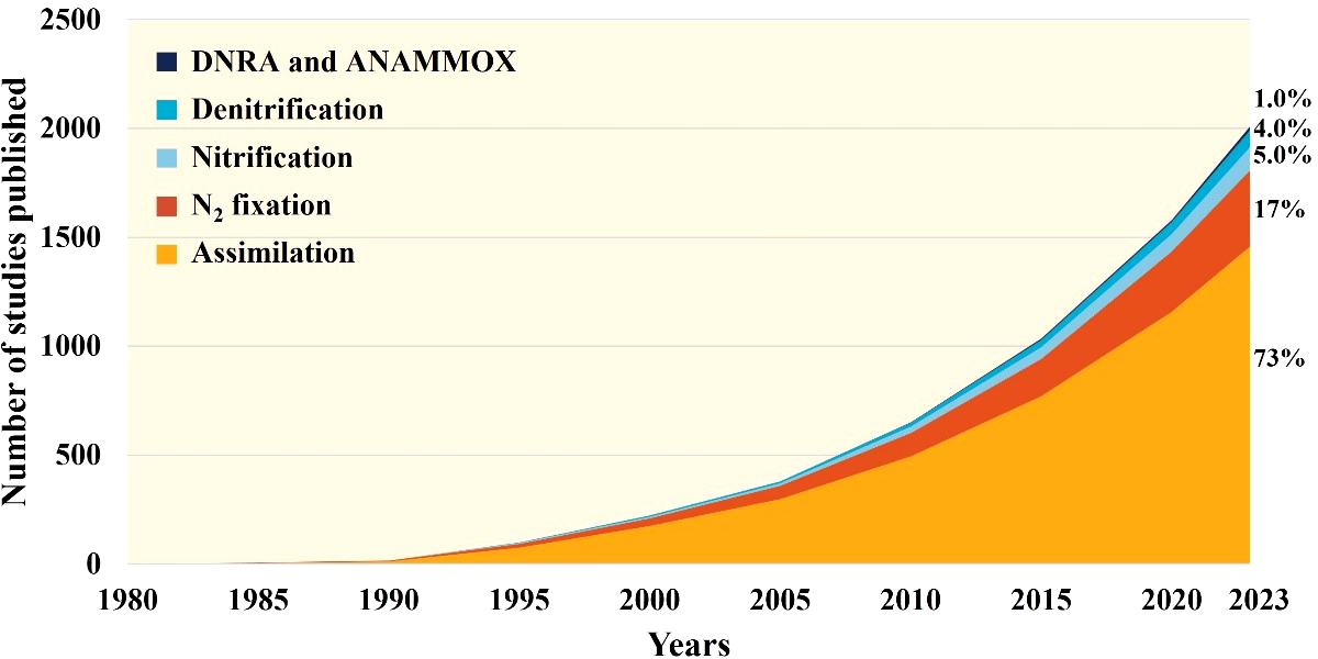 Mixotrophy, the primary mechanism by which coral holobionts acquire energy, has been extensively studied for its role in coral physiology. However, there is still much to be learned about nitrogen fixation, which has only recently begun to be explored in depth. Current investigations have been limited to different regions, seasons, and responses to environmental stress. Quantitative research on nitrification and denitrification processes has just begun, while DNRA and other processes have yet to receive sufficient attention. Based on the number of studies published on various nitrogen processes related to corals (as shown in Figure 3), we can gain some insight into the above-mentioned issue. The amount of researches on assimilation and N2 fixation related to coral is the largest, which is closely related to their long research history and their important role in balance nutrition, while the studies about nitrification and other processes is less significantly due to technical difficulties. We still need to strengthen further nitrogen research of coral holobionts in the future. So that we can know more about the influence of the different processes on coral health, which is crucial for understanding how coral holobionts build and collapse.