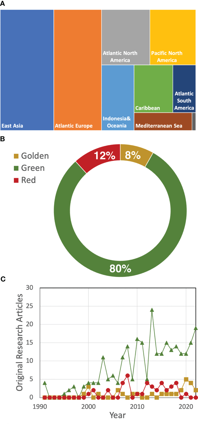 Number of mentions in eligible original research articles found in SCOPUS sorted by geographical region -the area is proportional to the number of mentions- (A), type of macroalgal bloom (B), and by type of bloom (green-triangles; golden-circles; red -squares) and year (C). In total, 265 original research articles published until 2022 were considered in the analysis.