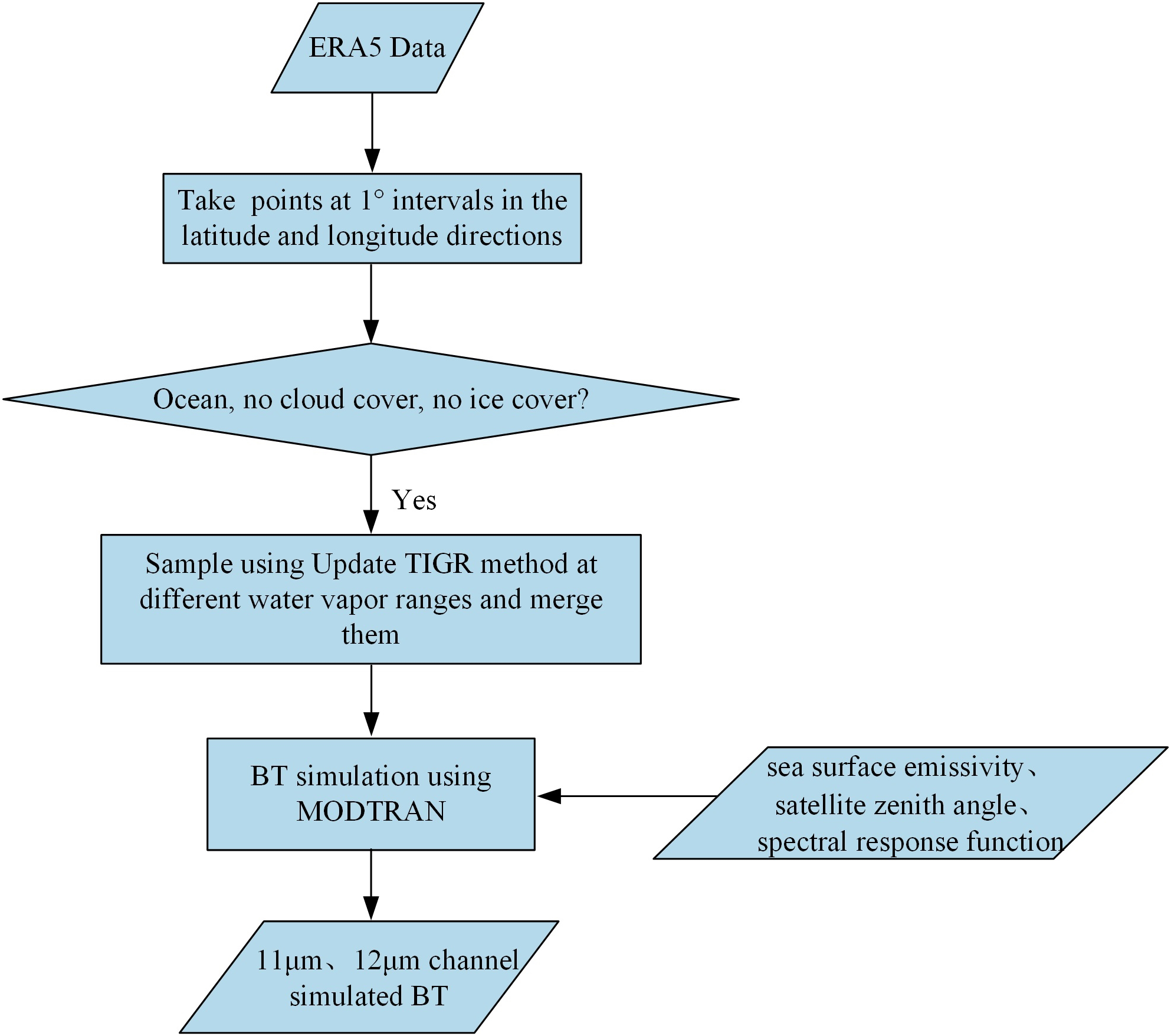Figure 1 shows that the selected ERA5 data are used with the sensor spectral response function, satellite zenith angle, and other information to simulate the BT using the MODTRAN, and the satellite zenith angles used for the simulation are set in 5° intervals from 0° to 50°. The simulated BTs of 11 μm and 12 μm channels are obtained and used for coefficients fitting of the SST retrieval algorithm.