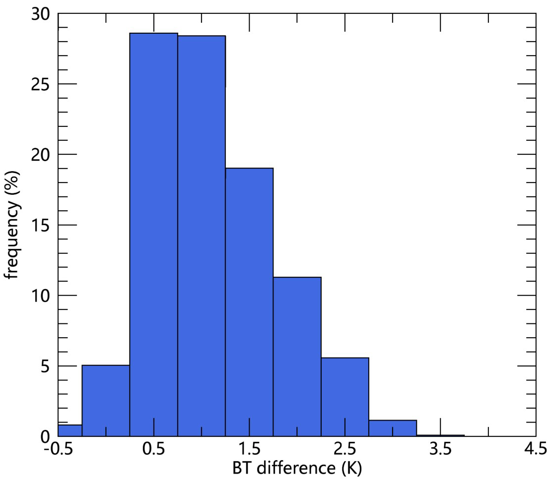 The frequency histogram distribution of the simulated BT difference of the selected profiles when the satellite zenith angle is 0°–50°.