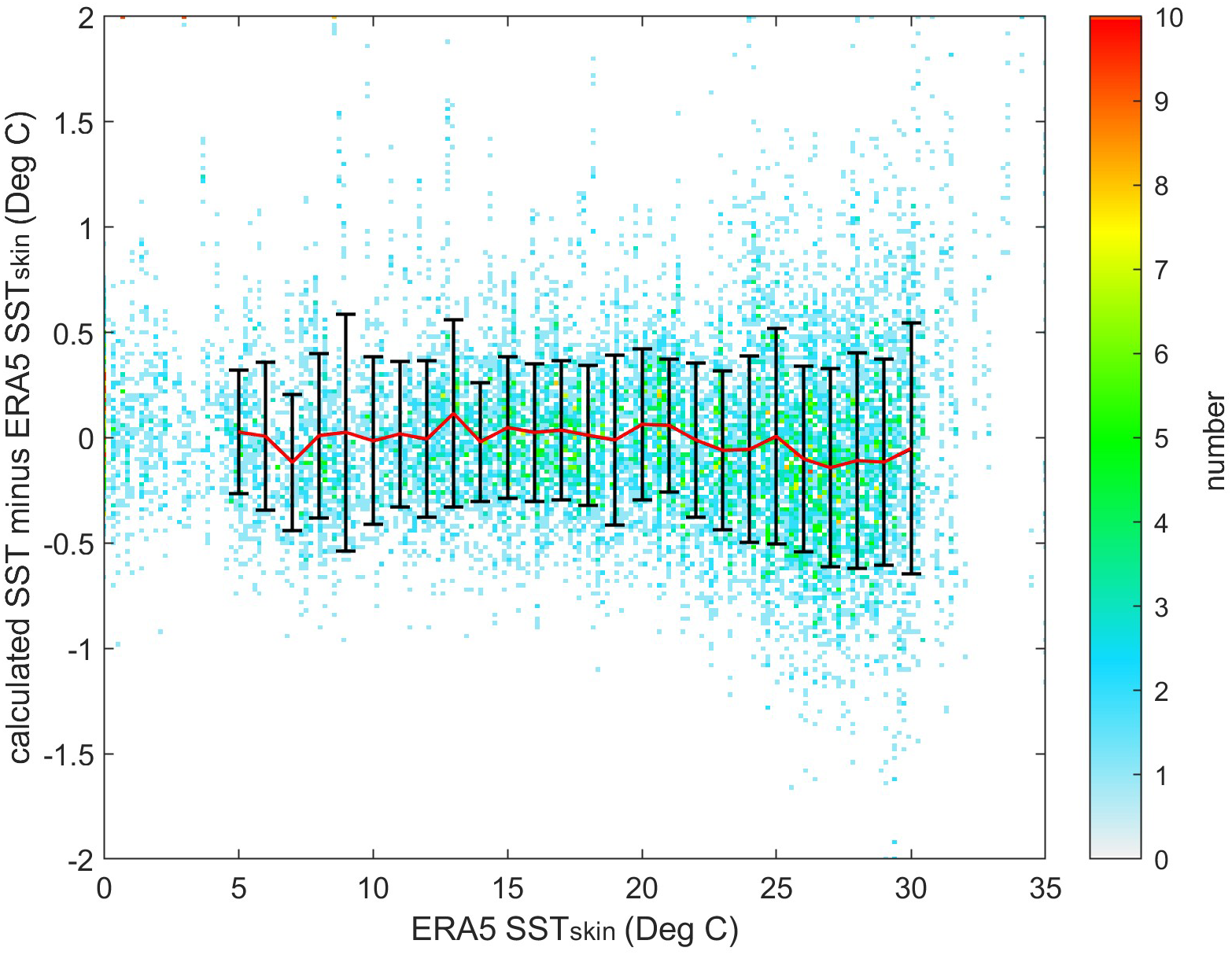 b1–b4 is the coefficients of MCSST, which are obtained by fitting ERA5 SSTskin and simulated BT. The simulated BT is added with 0.2 K Gaussian noise to be closer to the actual situation; thus, 2/3 of the data are used for fitting, and 1/3 of the data are used for validation. Figure 4 shows the relationship between ERA5 SSTskin and the 11 μm channel BT for the fitting dataset. Table 3 shows the coefficients of the SST retrieval algorithm. The validation dataset SST is obtained using the retrieval algorithm coefficients, the SST is compared with the ERA5 SSTskin, the bias is close to 0, and the standard deviation is 0.42°C. Table 4 shows the bias of the validation dataset between the calculated SST and the ERA5 SSTskin at each latitude band. The bias of each latitude band is close to 0, the standard deviation is between 0.28°C and 0.52°C, the standard deviation is the largest at 0–20°N, and the standard deviation is the smallest at 90°S–40°S. Figure 5 is the relationship between the calculated SST minus ERA5 SSTskin and ERA5 SSTskin. The color represents the number of matchups in the squares. The red and black lines represent the bias and standard deviation of a specific SST range, respectively. The bias has no apparent relationship with the SSTskin value. Figure 6 shows the relationship between the calculated SST minus ERA5 SSTskin and the simulated BT difference. The standard deviation increases with the increasing BT difference, but the maximum value is approximately 0.5°C. In summary, the algorithm has good performance and can be used for SST retrieval.