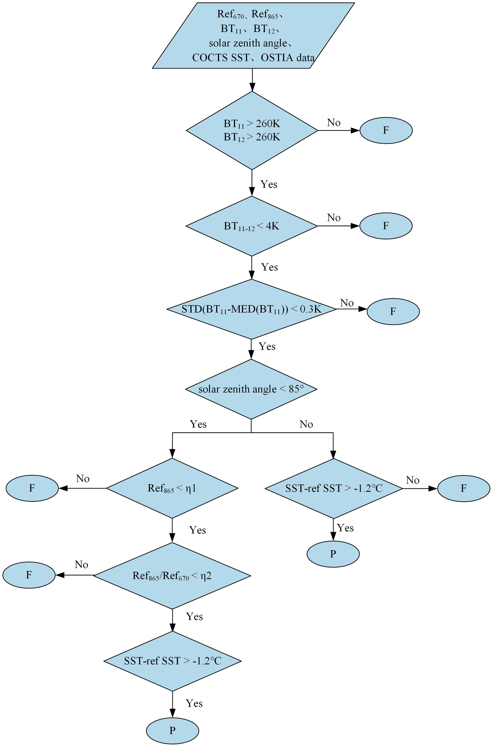In the daytime, determine whether the 865 nm channel reflectance is less than the threshold η1. Then determine whether the 865 nm channel reflectance to the 665 nm channel reflectance ratio is less than the threshold η1. It is determined to be cloud pixels if it is greater than or equal to the threshold. The thresholds here are all set as dynamic thresholds, and the thresholds of the glint areas are larger than other areas (Petrenko et al., 2010). Determine whether the difference between the COCTS SST and the reference SST is greater than −1.2°C, and if it is less than −1.2°C, it is determined as a cloud pixel.