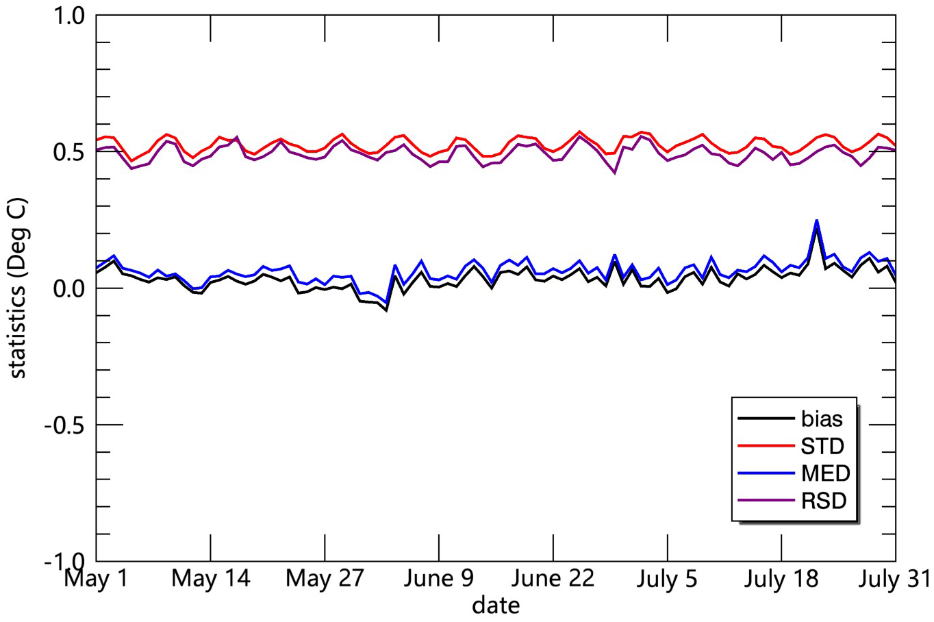 The NOAA-20 VIIRS L2P SST used in this paper is from the ACSPO system and it is provided by the NOAA National Centers for Environmental Information (NCEI). The biases of the ACSPO VIIRS SST from the buoy during the day and night are close to 0, and the standard deviations are less than 0.5°C (Petrenko et al., 2014). The validation results of the ACSPO VIIRS SST show that it can be used for the evaluation of the COCTS SST in this study. The data format of VIIRS L2P SST is NetCDF.