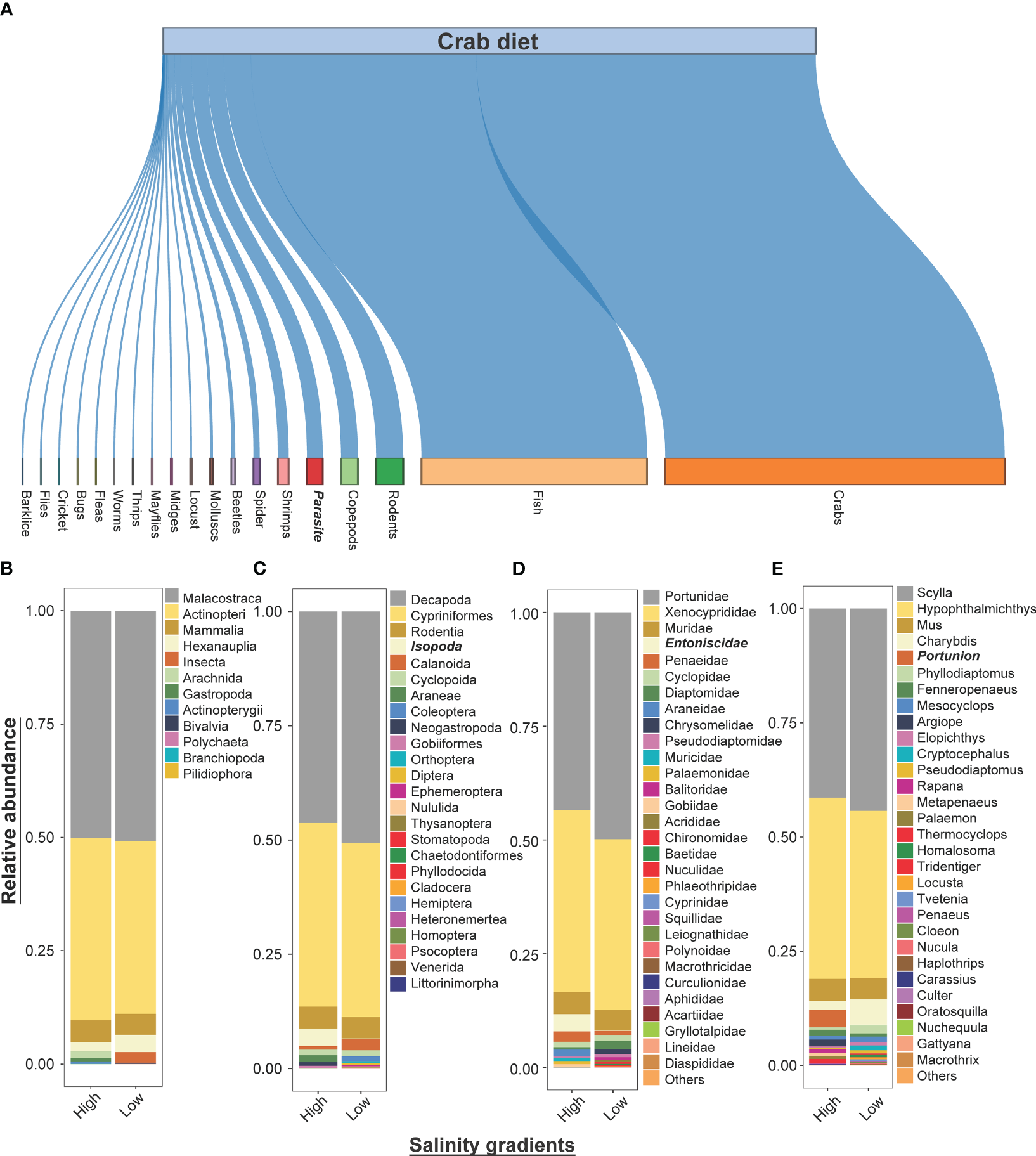 The figure shows the (A) dietary compositions of mud crabs captured from both salinity gradients. It also shows the relative abundance (%) of prey (B) classes, (C) orders, top 30 (D) families and (E) genera detected in diet of mud crabs. The mud crabs were captured from marine environment with varying salinities, with some having high-salinity and other low-salinity levels. The taxa names in bold and italic represent crab endoparasites.
