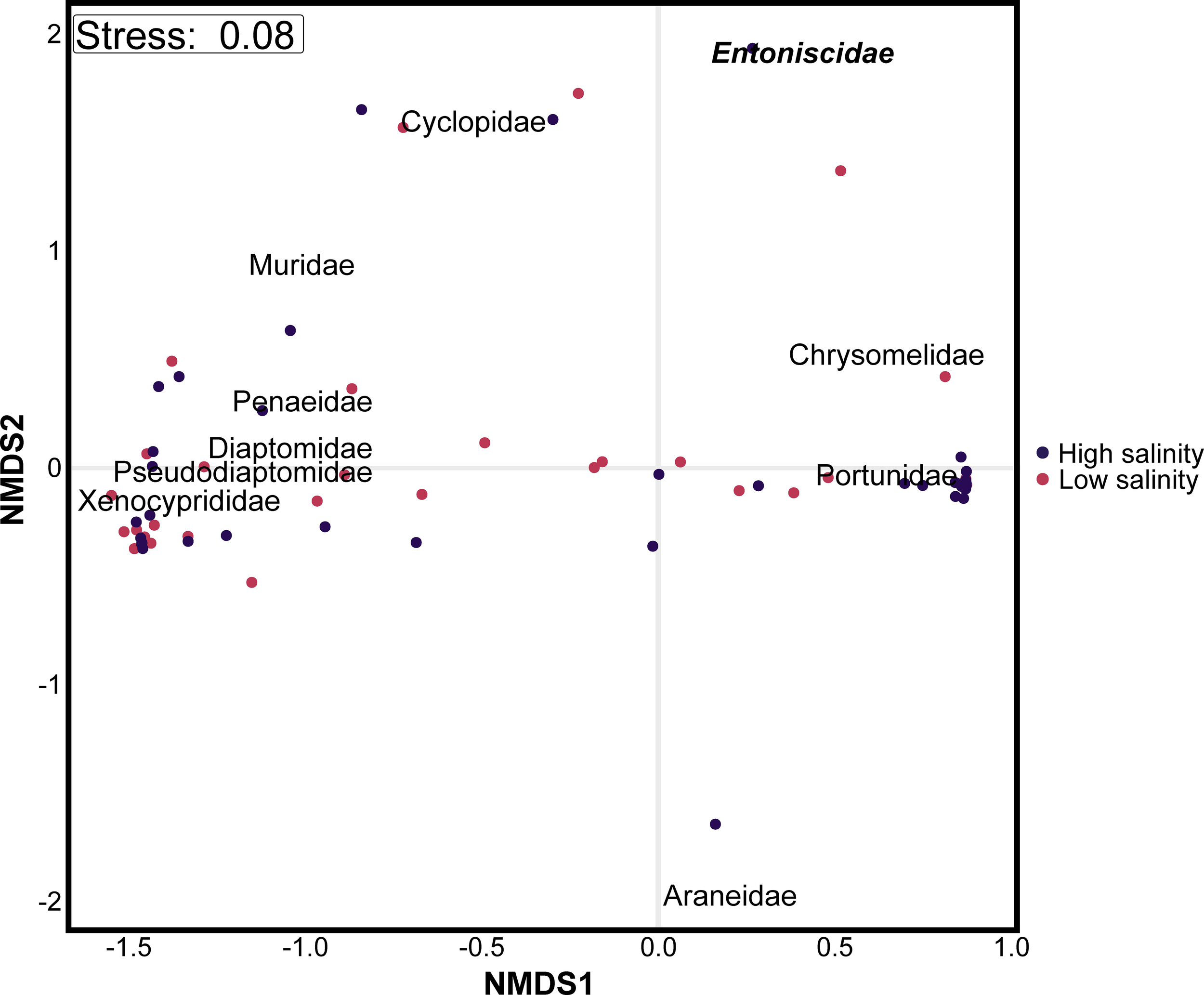 Non-metric dimensional scaling (NMDS) ordination plot depicting the Bray-cutis dissimilarities of prey taxa detected in the diet of mud crabs, captured from two distinct salinity levels (high and low salinity). The taxa names in bold and italic represent crab endoparasites.