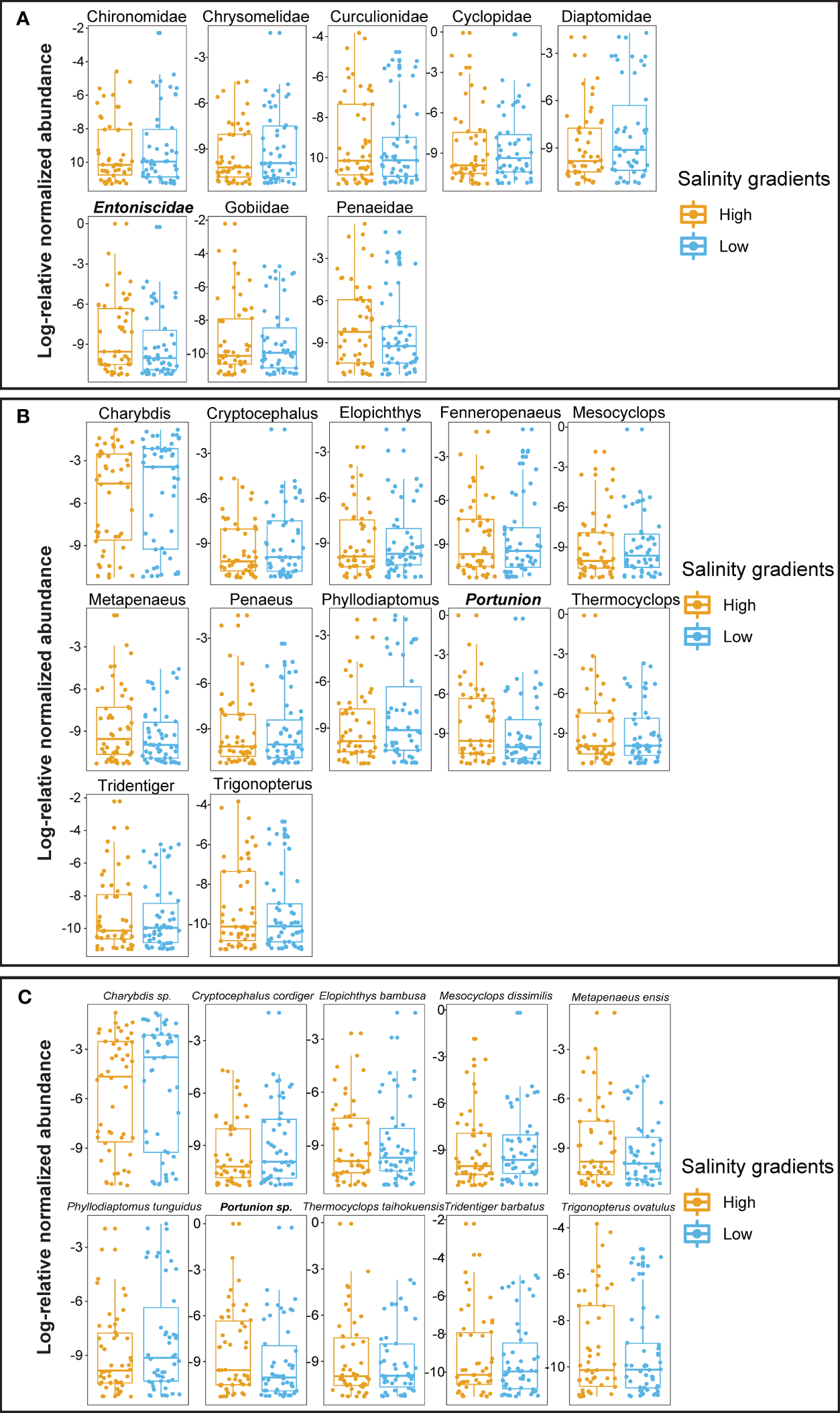 Differential relative abundances of highly significant (padj < 0.001) prey (A) families, (B) genera and (C) species detected in the diet of mud crabs collected from high and low salinity. The Pearson correlation test was conducted using DESeq. padj corresponds to the p-value adjusted for multiple correlation testing using the Benjamini–Hochberg method with a significance level of <0.001. The taxa names in bold and italic represent crab endoparasites.