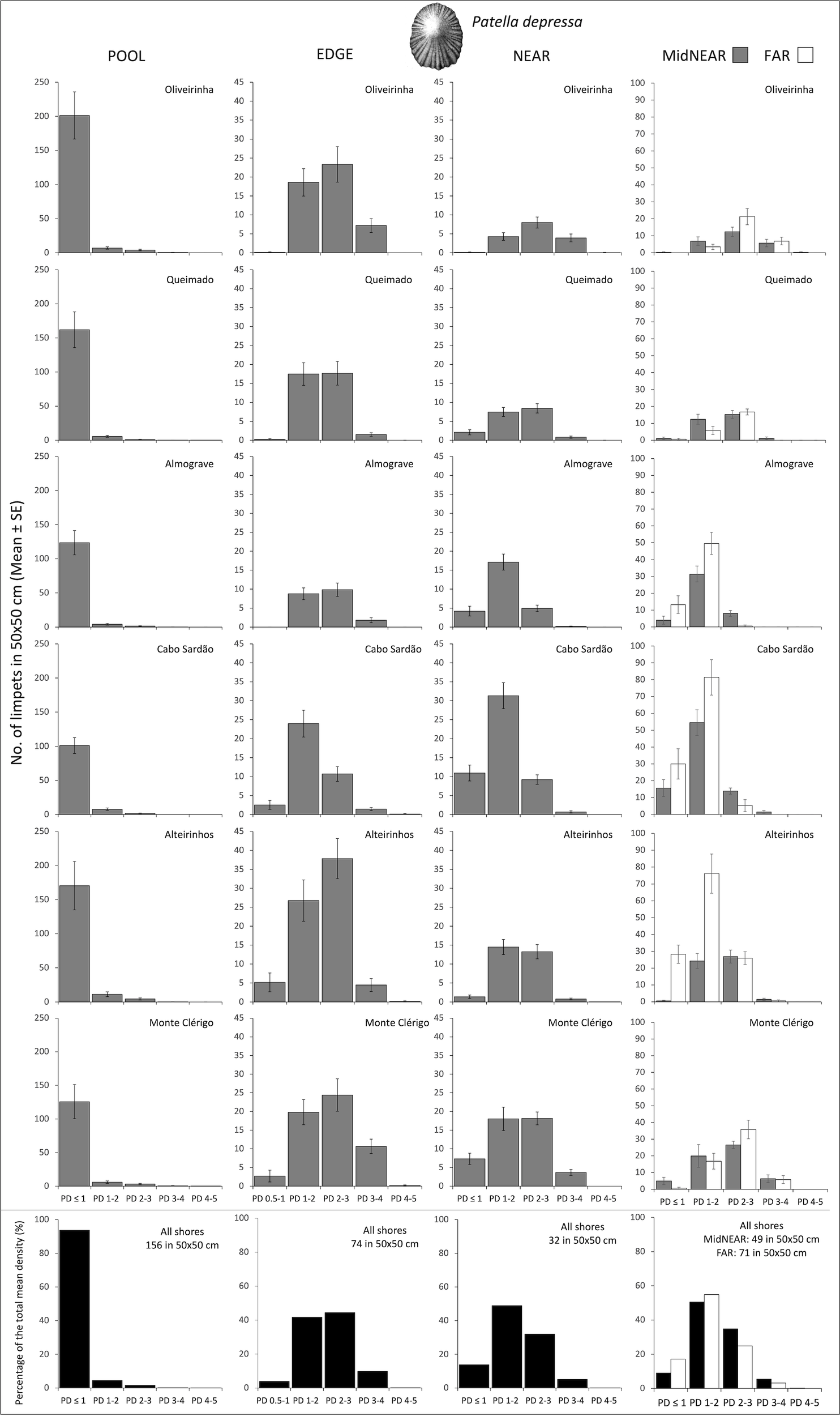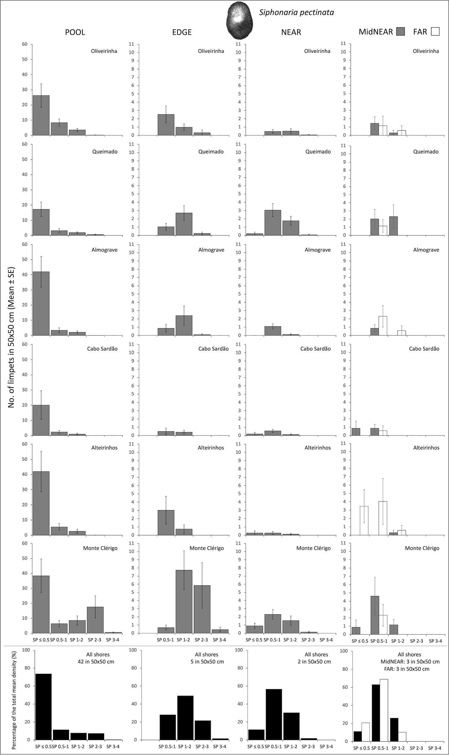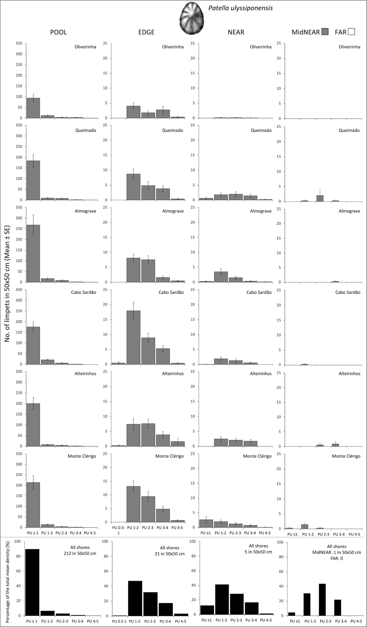 Densities and size-class structure of Patella ulyssiponensis on six shores within POOL (inside rockpools), EDGE (edge of rockpools), and NEAR (open-rock surrounding rockpools) micro-habitats (three left columns); and within areas of mid-shore open-rock at two proximity categories from rockpools (MidNEAR and FAR, far right column). For POOL, EDGE, and NEAR, the sample size in each shore was the following: 52 in Oliveirinha, 51 in Queimado, 57 in Almograve, 56 in Cabo Sardão, 53 in Alteirinhos, and 54 in Monte Clérigo. For MidNEAR and FAR, n = 12 on each shore. Gray bars are mean (± SE) number of limpets of five size classes per 50×50 cm. Note different y-axis scale between graphs of POOL vs. others. Black bars (bottom row) are percentages of every size class relatively to the total density of this species (value given top right of each graph) within each micro-habitat and across all shores. NB P. ulyssiponensis was absent in FAR.