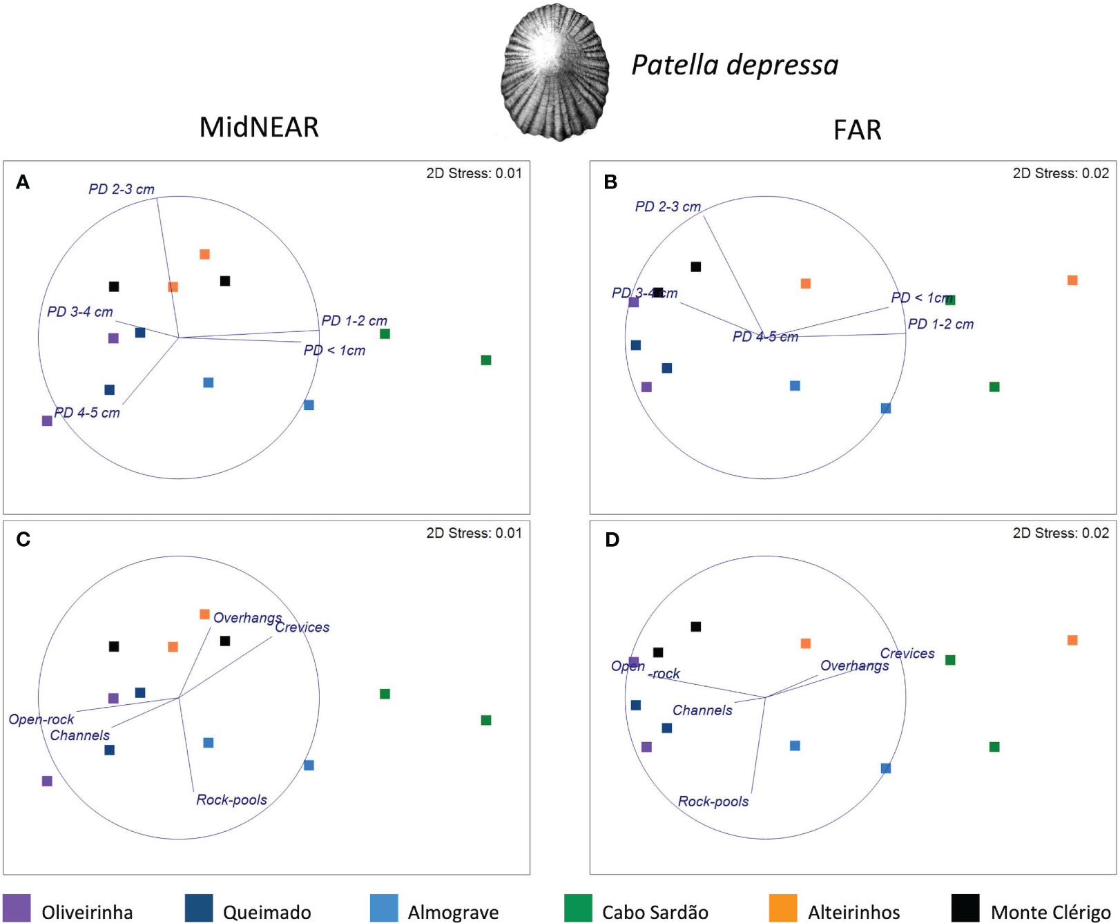 Three-way PERMANOVAs were performed separately for each of two species (P. depressa and S. pectinata) to test for differences in limpet populations living on mid-shore open-rock between areas close to and further away from pools, and among shores and stretches (proximity to rockpools—fixed factor with two levels: MidNEAR and FAR; Shore—fixed factor with six levels; Stretch—random factor with two levels, nested in Shore; n = 6). In the case of P. depressa, for which a significant interaction was found between Proximity and Shore, non-metric multidimensional scaling (MDS) was then done separately for each level of factor Proximity (MidNEAR, FAR), to visualize the distance among stretches of all shores and correlation vectors of the response variables (size-class densities of P. depressa). In duplicate MDS plots, vectors of predictors of landscape variability were overlaid (i.e., mean percentages of occurrence of five micro-habitat categories within stretches of every shore).