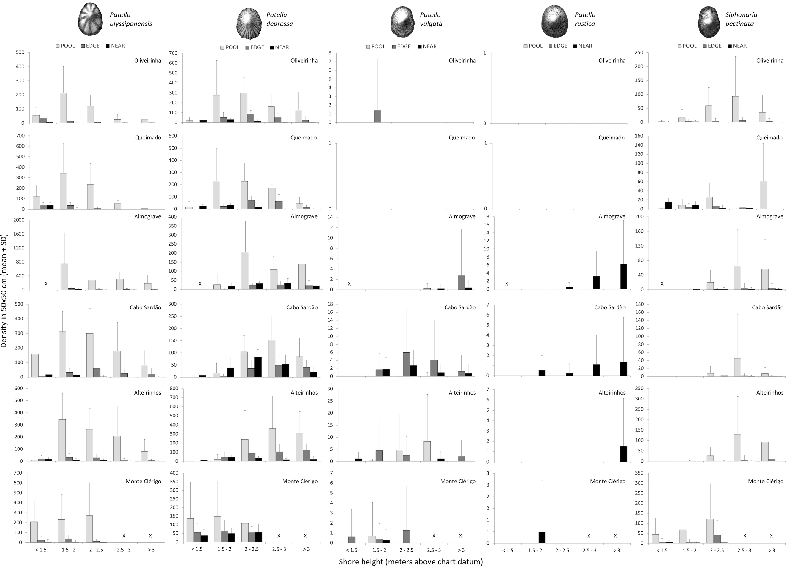 A total of 15,619 limpets were recorded. Within each micro-habitat, the numbers sampled and percentage of each species were as follows: 7,603 limpets within pools (POOL: 54% P. ulyssiponensis, 32% P. depressa, 14% S. pectinata, 0.1% P. vulgata, and 0.6% of non-identified juvenile patellids); 3,472 limpets around pool edges (EDGE: 58% P. depressa, 35% P. ulyssiponensis, 6% S. pectinata, and 1% P. vulgata); 3,771 limpets on open-rock surfaces near to pools (NEAR: 79% P. depressa, 12% P. ulyssiponensis, 6% S. pectinata, 2% P. rustica, and 1% P. vulgata) and 773 limpets on mid-shore open-rock surfaces further away from pools (FAR: 95% P. depressa, 4% S. pectinata, and 1% P. rustica). Patella ulyssiponensis, P. depressa, and S. pectinata were present across POOL, EDGE, and NEAR on all shores (Figures 2–4), while the two other patellids were rare (Supplementary Figures S1, S2).