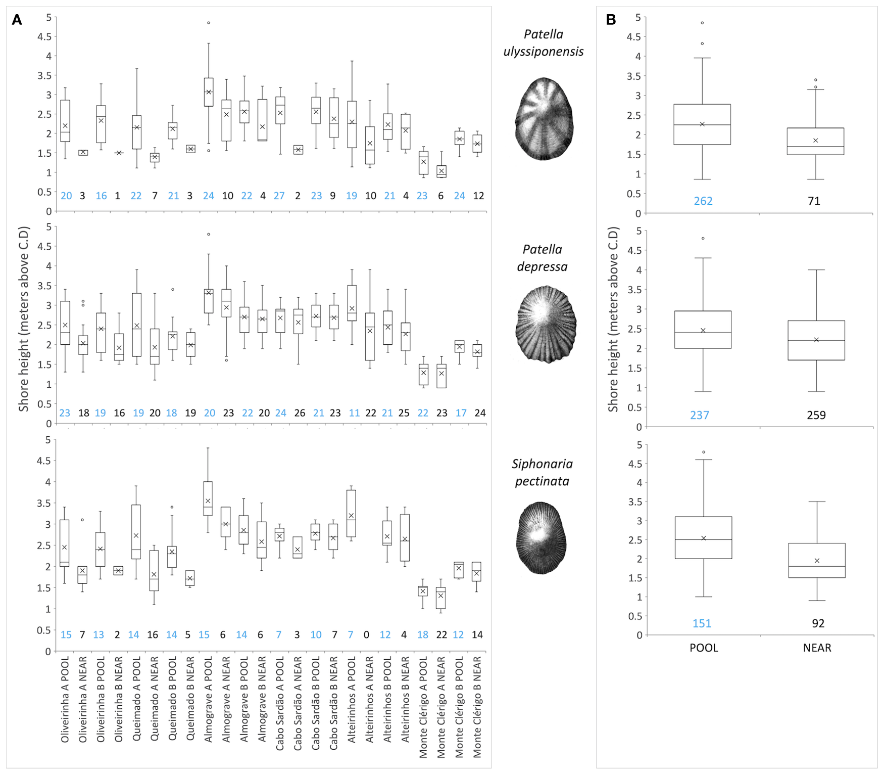 Binomial tests (Sokal and Rohlf, 1995) assessed if upward extension occurred in three species of limpets (P. ulyssiponensis, P. depressa, and S. pectinata) inside rockpools (POOL), compared to outside rockpools (NEAR). Data were assembled separately for each species, through the following steps: i) every replicate where the presence of a given species was found was selected from the 323 replicates of both POOL and NEAR; ii) for each of the two micro-habitats, the shore-height records of all selected replicates were considered; iii) from these records, the median, mean, maximum, and minimum values of shore height within each micro-habitat (four pairs of variables per species) were calculated for each sampled stretch of coast (12 stretches, corresponding to two stretches within each of six shores). The general null hypothesis that the median, mean, highest, or lowest shore height of a limpet species occurrence is similar between the two micro-habitats was analyzed by individual binomial tests. In each binomial test, 12 POOL and 12 NEAR values were compared.