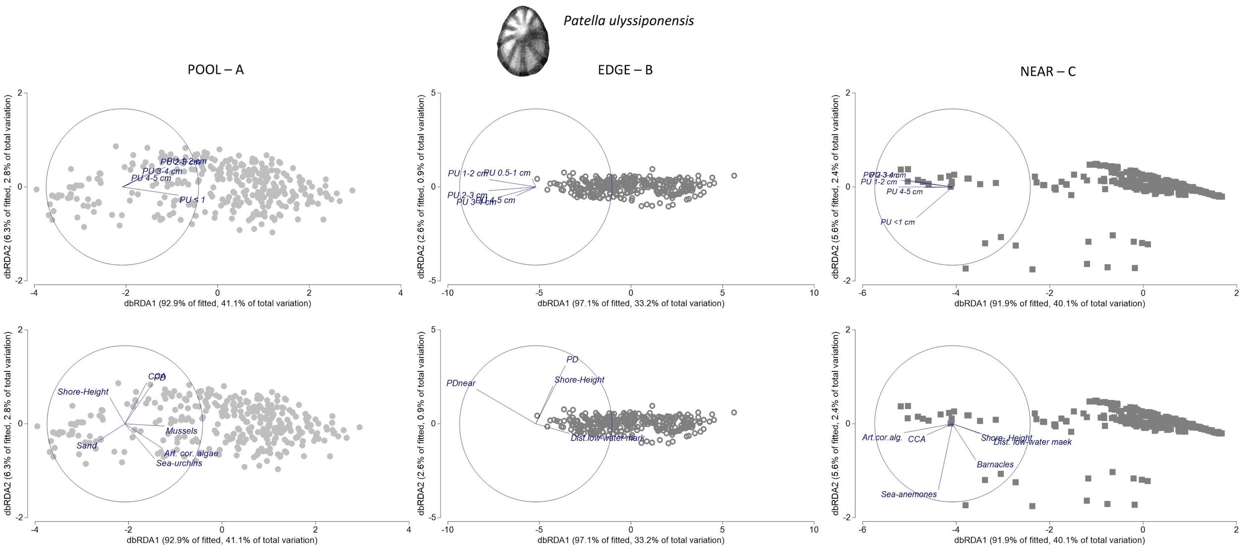 Within both POOL and NEAR of every rockpool system, we assessed the following habitat-composition variables (details in Supplementary Table S1): i) the percentage cover of 15 space-occupying categories (rock, sand, Lichinaceae, Verrucariaceae, cyanophytes, crustose non-coralline algae, CCA, articulated coralline algae, seaweed, Porifera, sea anemones, barnacles, mussels, sea urchins, and other sessile invertebrates), i.e., substratum types and functional groups of sessile organisms and ii) counts of two groups of non-limpet mobile grazer gastropods, i.e., trochids (including Steromphala umbilicalis, S. pennanti, Phorcus sauciatus, and P. lineatus) and littorinids (Melarhaphe neritoides), both standardized to densities in 50×50 cm. All taxa were visually identified in the field to the lowest possible taxonomic resolution and then lumped into functional groups of sessile or mobile organisms.