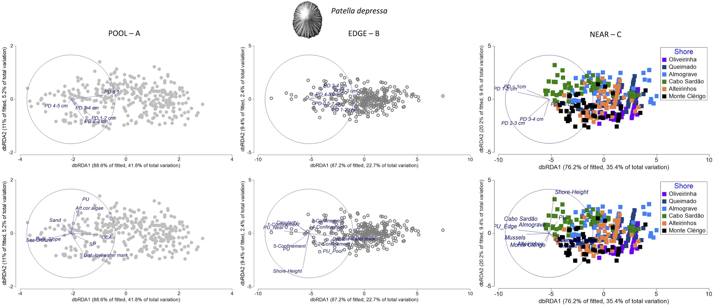 Two-way non-parametric multivariate analyses of variance (PERMANOVA, Anderson, 2001) were made separately for each of the three species of limpets (P. ulyssiponensis, P. depressa, and S. pectinata), within each of the three micro-habitats (POOL, EDGE, and NEAR), to test for differences in limpet populations among the six shores and among the two stretches within each shore (shore—fixed factor with six levels; stretch—random factor with two levels, nested in shore; sample size varied between 25 and 30 rockpools per stretch).