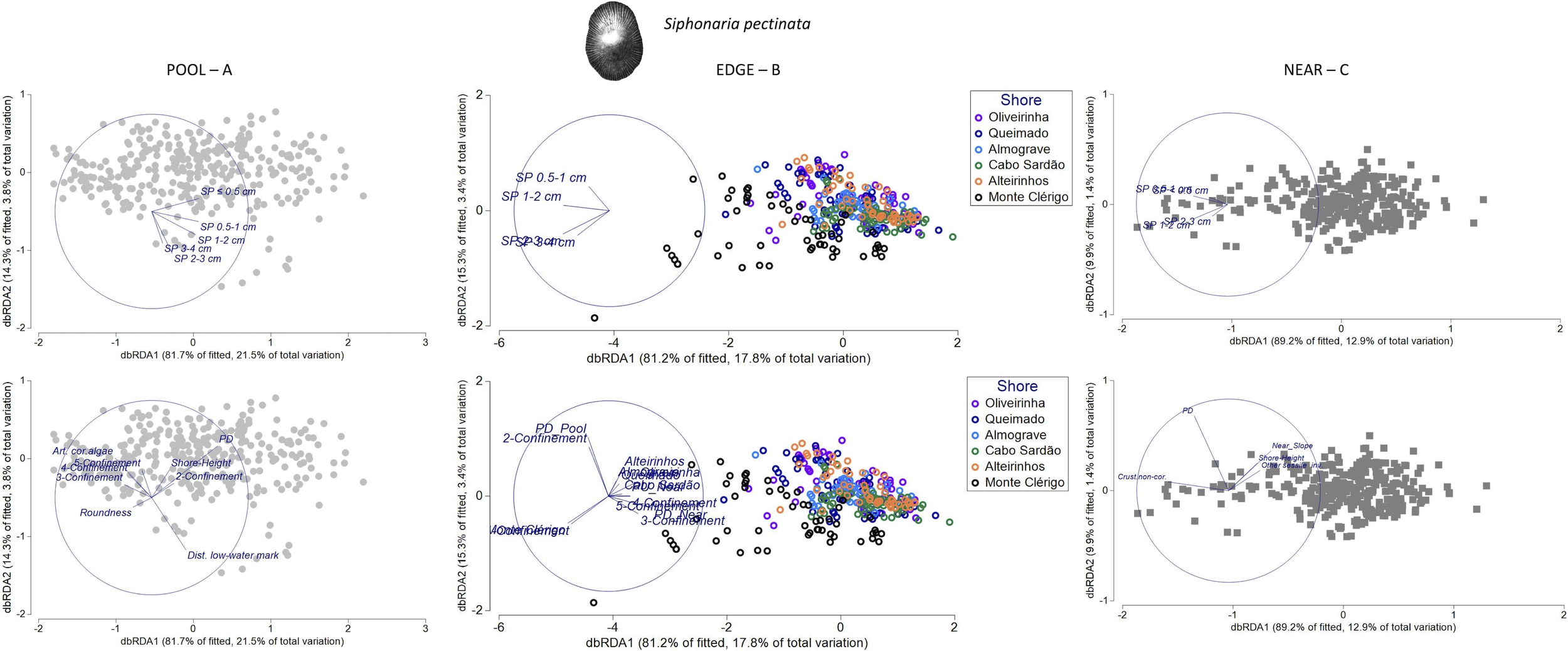 A set of 19 physical variables was assessed for each of the 323 sampled rockpools, in the field or through image analysis (details in Supplementary Table S1). Each variable corresponds to a quantitative or qualitative metric associated with size (perimeter, surface area, and volume), shape (circularity, roundness, aspect ratio, and curved or straight edges), topography (maximum and mean depth, POOL and NEAR slope, POOL and NEAR topographic complexity, “confinement”), or position (straight and contoured distance to the nearest rockpool, shore height, distance to low-water mark, and “barriers”) of rockpools and/or surrounding rock. “Confinement” was the height of the rocks surrounding the pool (1, pool flushes with surrounding rock; 2, low walls, <3 cm; 3, medium-height walls, 3–6 cm; 4, high walls, 6–10 cm; 5, very-high walls, >10 cm and often with obtuse angles). “Barriers” was presence or absence of outcrops of rock to seaward at <1 m from the pool. Although a few variables applied only to a single micro-habitat (volume, maximum, and mean depth: POOL-only; slope and topographic complexity: separately assessed inside pools and on surrounding rock), most were physical descriptors of each rockpool system across POOL, EDGE, and NEAR (shape and position variables applying to the three micro-habitats; perimeter and surface area of a rockpool are proportional to the ones of its surrounds).