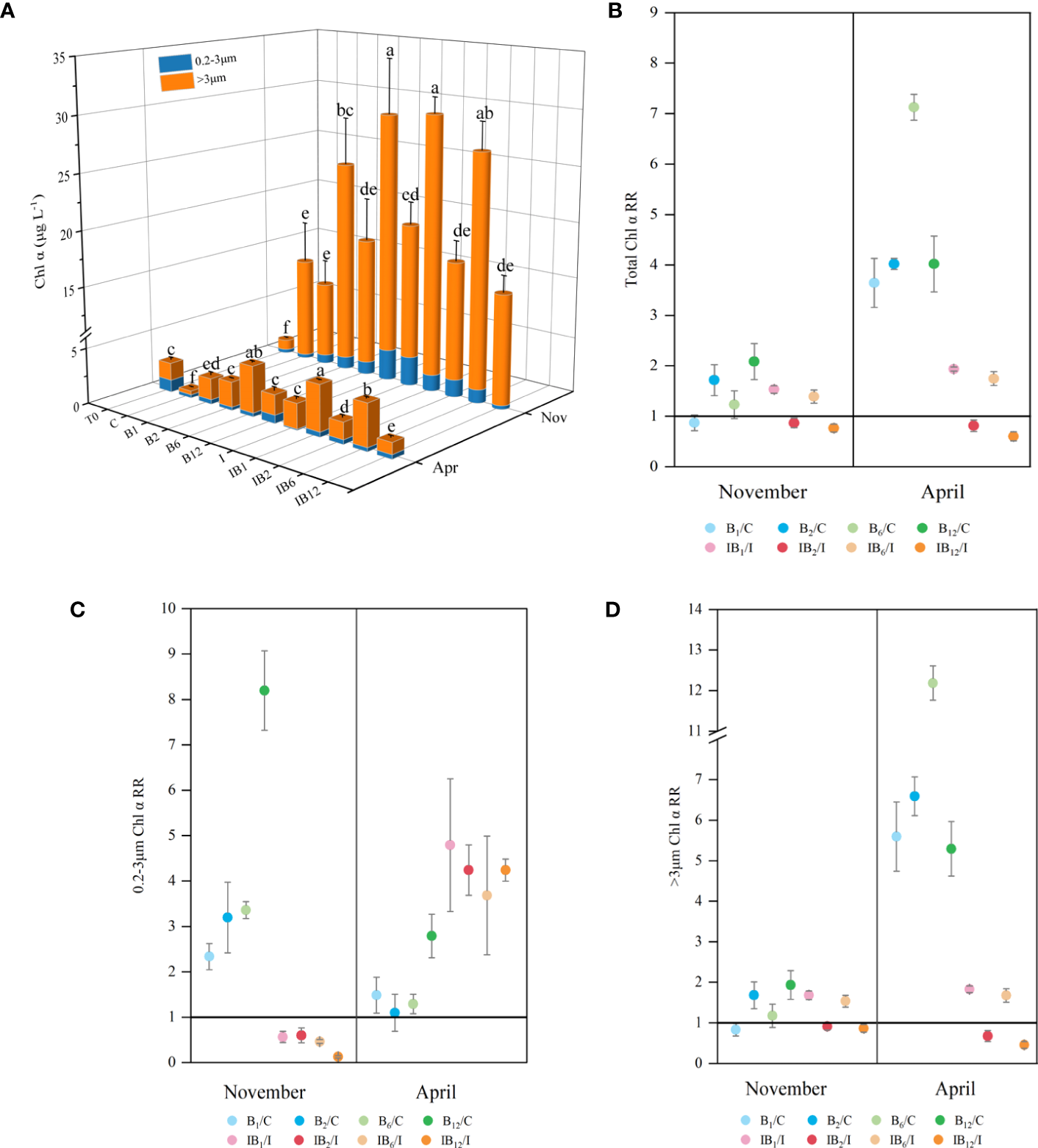 The total chlorophyll α (Chl α) was measured to assess phytoplankton biomass (Figure 2A). After the end of the experiments, the phytoplankton biomass of all treatments increased significantly in November compared with the initial biomass (T0), and the total Chl α ranged from 12.10-29.52 μg L-1, while that in April was only 0.64-4.58 μg L-1. In 87.5% of the eight treatments supplemented with B vitamins, total Chl α showed significant positive responses compared to the control treatment (ANOVA, p < 0.05). In terms of response rate (RR) (Figure 2B), the range of positive RR of treatments in November was 1.22-2.08, while in April, the highest was as high as 7.12, and the average positive RR was 3.75. The positive response ratios in April were 1.54-8.96 times higher than those in November (Figure 2B). Only 50% of treatments comprising a mixture of B vitamins and inorganic nutrients had a slight secondary response, and there were IB1 and IB6 treatments with RRs slightly greater than 1. The response rates of IB2 and IB12 were less than 1, indicating that there was no secondary response of phytoplankton to vitamin B in these two treatments.