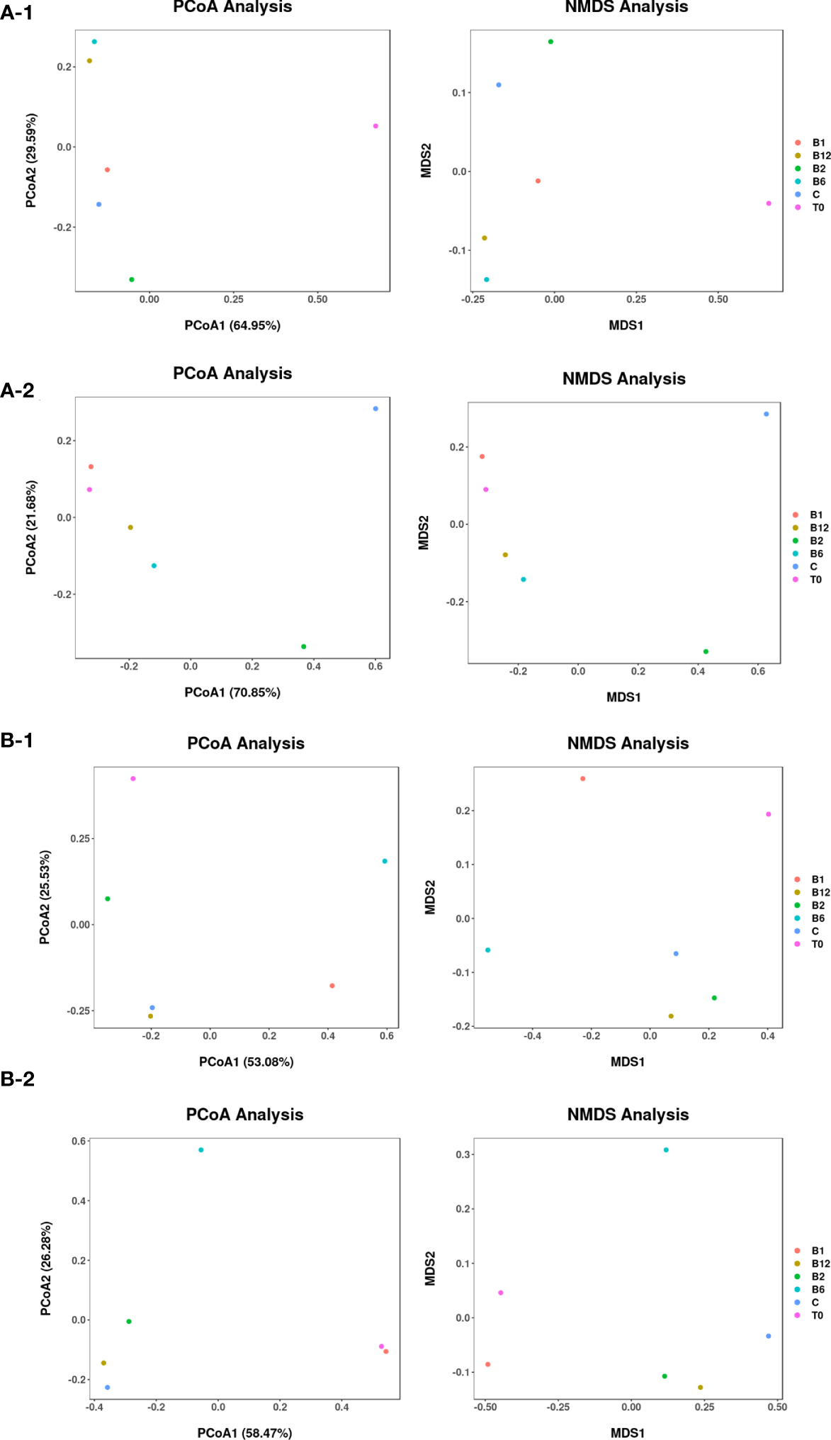 Principal coordinate analysis (PCoA) and nonmetric multidimensional scaling (NMDS) based on Bray−Curtis distance at the operational taxonomic unit (OTU) level of phytoplankton (A) and zooplankton (B) at the initial (T0) and endpoint of experiments, which were conducted in November (A-1, B-1) and April (A-2, B-2).