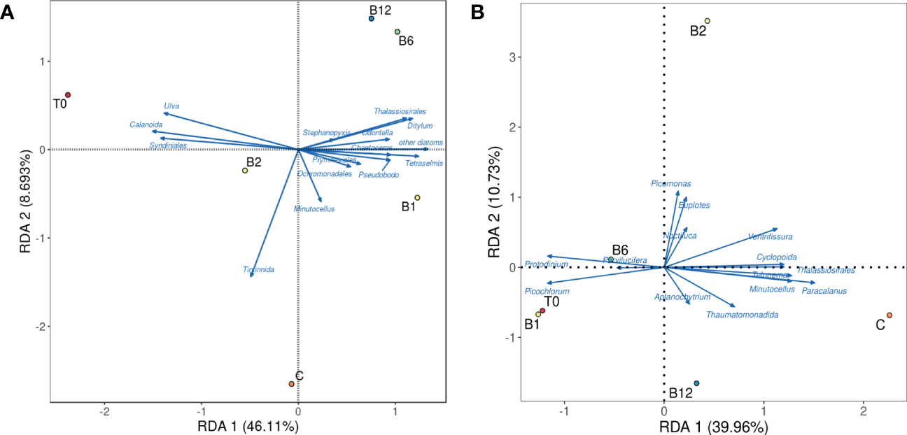 Redundancy analysis (RDA) of B vitamin responses by specific species phytoplankton and zooplankton. Filled symbols represent B vitamins supplementation samples in (A) November and (B) April.