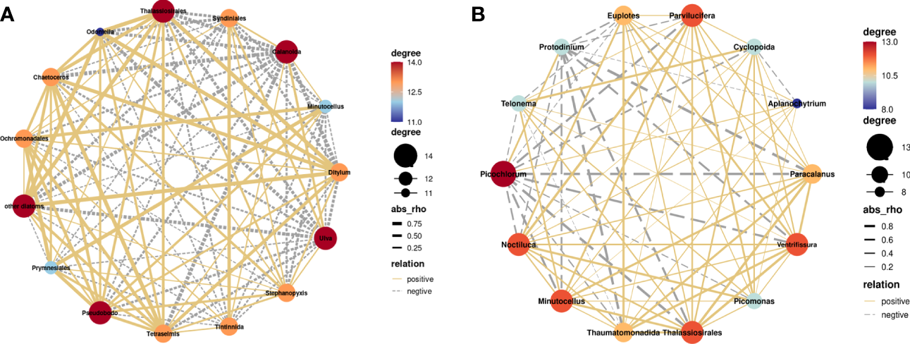 Response ratios (RRs) were calculated to intuitively illustrate the responses of phytoplankton and bacteria to B vitamin supplementation (Barber-Lluch et al., 2019; Joglar et al., 2020). Phytoplankton and bacterial biomass of B vitamin amendment treatments were divided by control treatment values, and when combined with inorganic nutrients and B vitamins, treatments were divided by inorganic nutrient (I) treatment values. RR values >1 indicate a positive response, RR values = 1 imply no response, and RR values <1 signify a negative response; the further RR values deviate from 1, the more pronounced the response. One-way ANOVA and t-tests were employed to test significant differences between treatments. Principal coordinates analysis (PCoA) and non-metric multidimensional scaling (NMDS) were used to display community composition differences across seasons at the OTU level. Pearson/Spearman correlation analysis and redundancy analysis (RDA) were employed to assess correlations between specific copepods and phytoplankton. Detrended correspondence analysis (DCA) for biological data was applied to determine whether to use linear or unimodal ordination methods. Correlation networks were constructed using OmicStudio tools at https://www.omicstudio.cn/tool. All statistical analyses were considered significant at the 0.05 significance level.