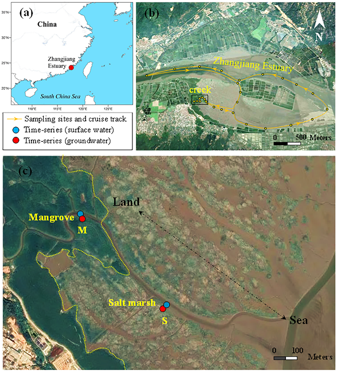 Herein, we focused on the spatial and temporal distribution of DSi and vertical DSi fluxes across the Sediment-Water Interface (hereafter âSWIâ) in a subtropical mangrove wetland system invaded by the salt marshes. We conducted seasonal observations in the mangrove-salt marsh-tidal creek-Zhangjiang Estuary continuum from 2017 to 2020. Two time-series observations of physicochemical parameters and DSi concentrations in surface water and groundwater were conducted during a spring-neap tidal cycle in 2020. The specific objectives of this study were to: (1) explore the seasonal and spatial variations of DSi concentration across the mangrove-salt marsh creekâestuary continuum; (2) estimate DSi fluxes across the SWI in the mangroves and salt marshes; (3) reveal the key factors and processes controlling DSi export-import pattern in the mangrove-salt marsh ecotone.