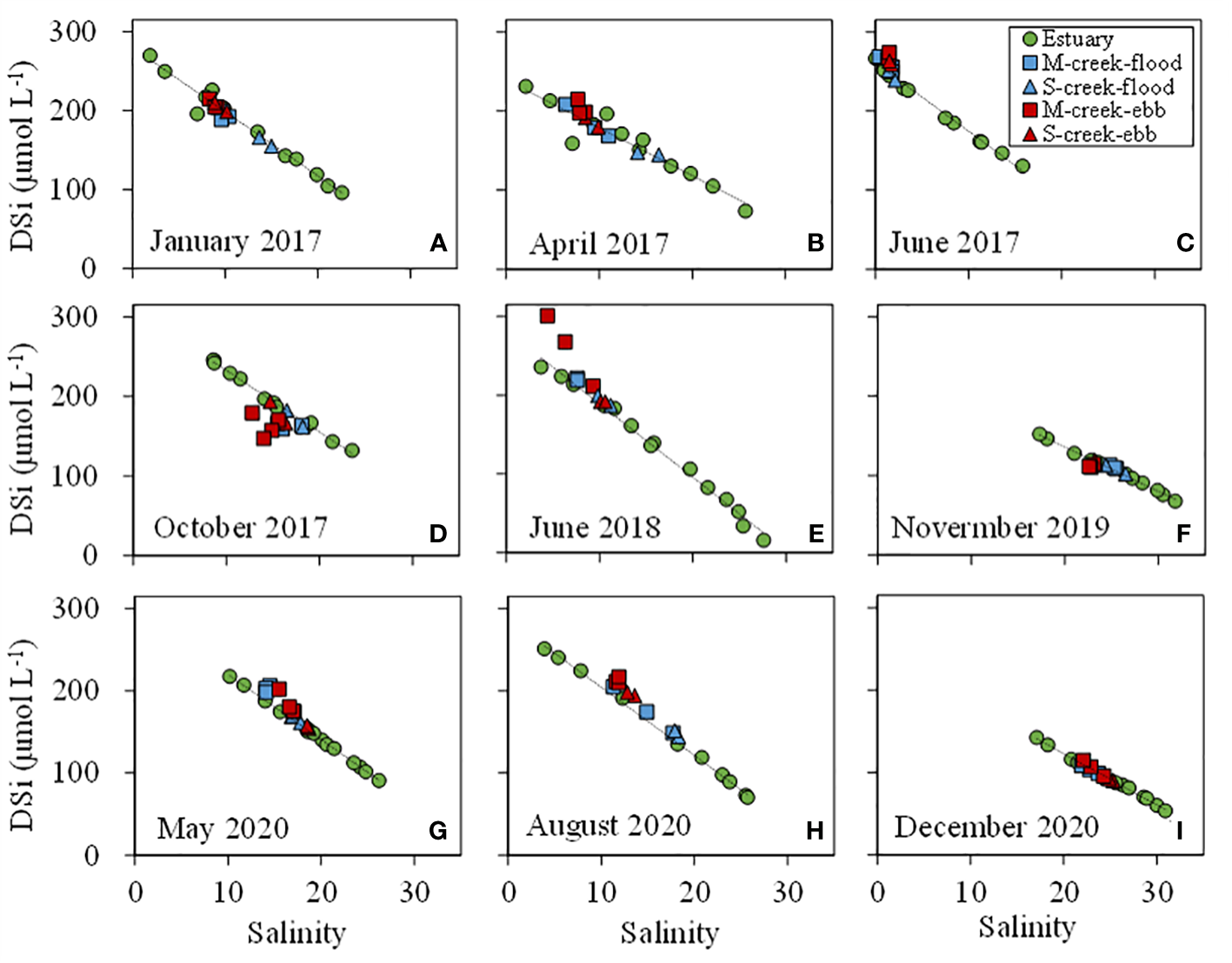 Diagrams of DSi against salinity (2017-2020). The squares and triangles indicate the concentrations in mangrove (M, blue) and salt marsh (S, red) creek in flood and ebb tides, respectively. The green circles mean the concentrations in Zhangjiang Estuary, showing a conservative mixing (black dotted line) along the salinity gradient.