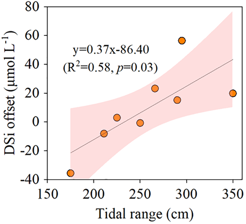 Linear regression was carried out to analyze the relationship between DSi offset and tidal range in ebb tides.