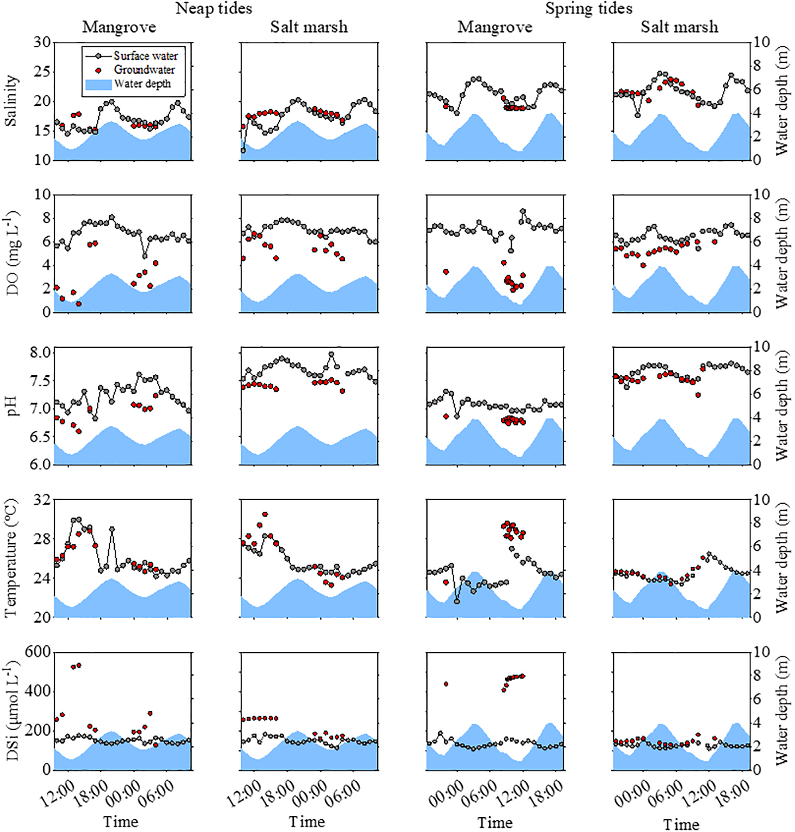 Tidal variations of water depth, salinity, DO concentrations, pH values, temperature and DSi concentrations in surface water (grey circles) and groundwater (red circles) in the mangroves and salt marshes during neap tides (11th-12th October 2020) and spring tides (20th-21st October 2020). The data on water depth, salinity and DO was derived from our companion article (Wang et al., 2022b).