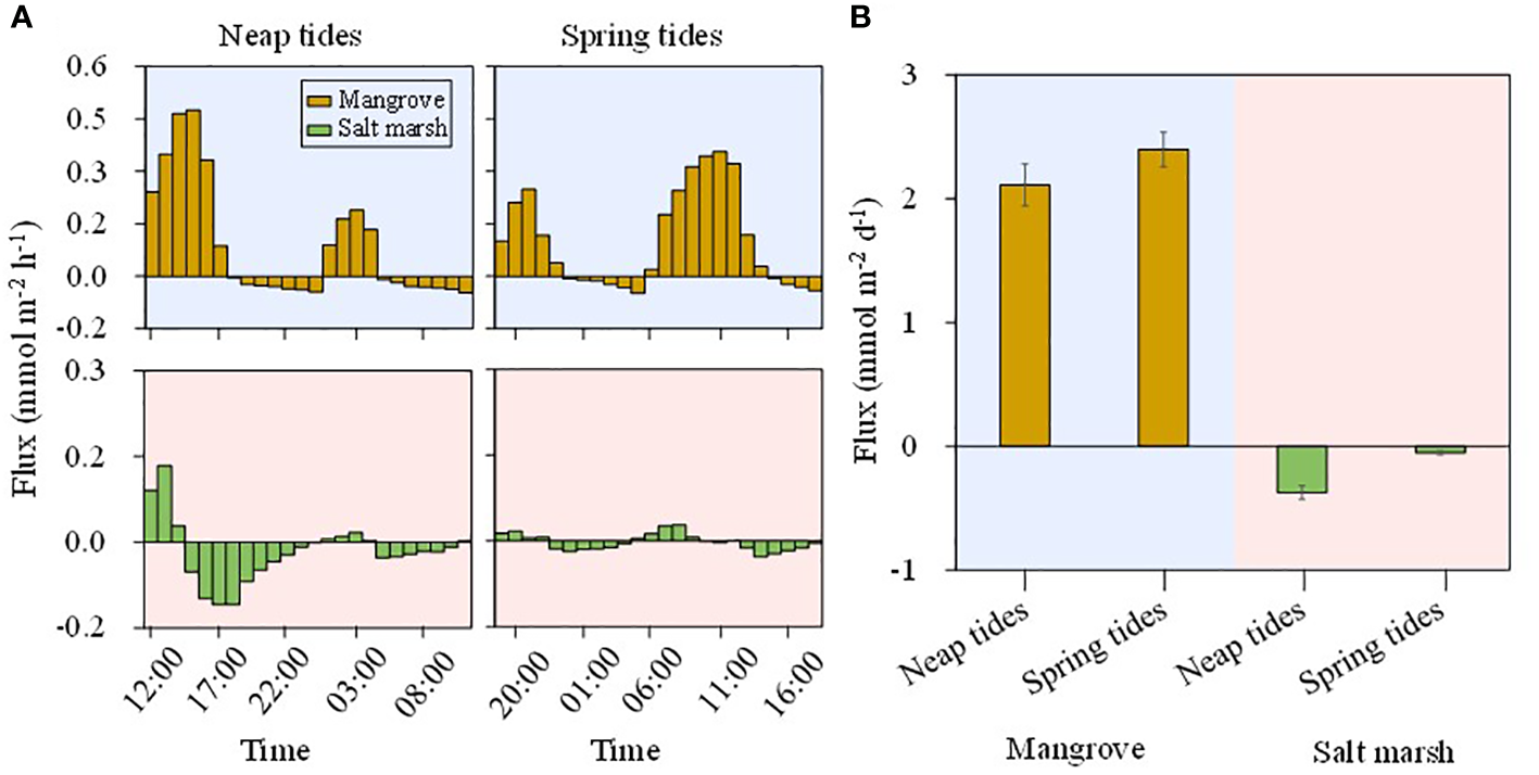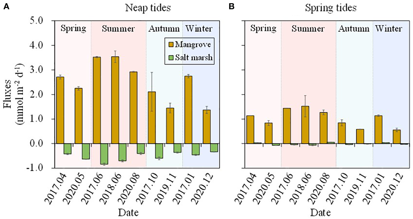 Estimated vertical fluxes of DSi during neap tides (A) and spring tides (B) based on the seasonal observations in mangrove and salt marsh creek during 2017-2020.