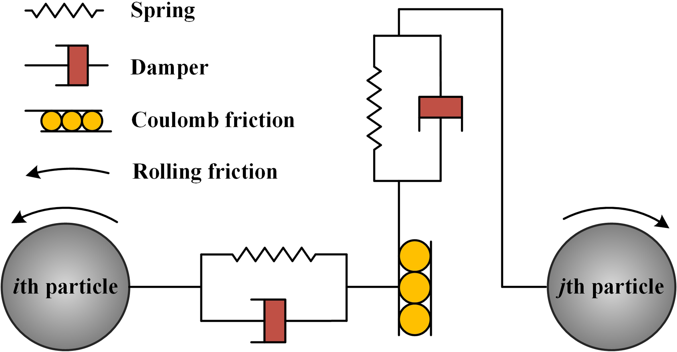 where mi, vi, Ii, and ωi are the mass, translational velocity, rotational inertia and the rotational velocity of the ith particle, Fc,ij represents the contact or collision force between the ith particle and the jth particle, Fg,i is the gravitational force, and Tij is the torque from the jth particle to ith particle due to collision. The classic Hertz-Mindlin (no-slip) with rolling friction model (see Figure 2) is employed for describing the inter-particle interaction: