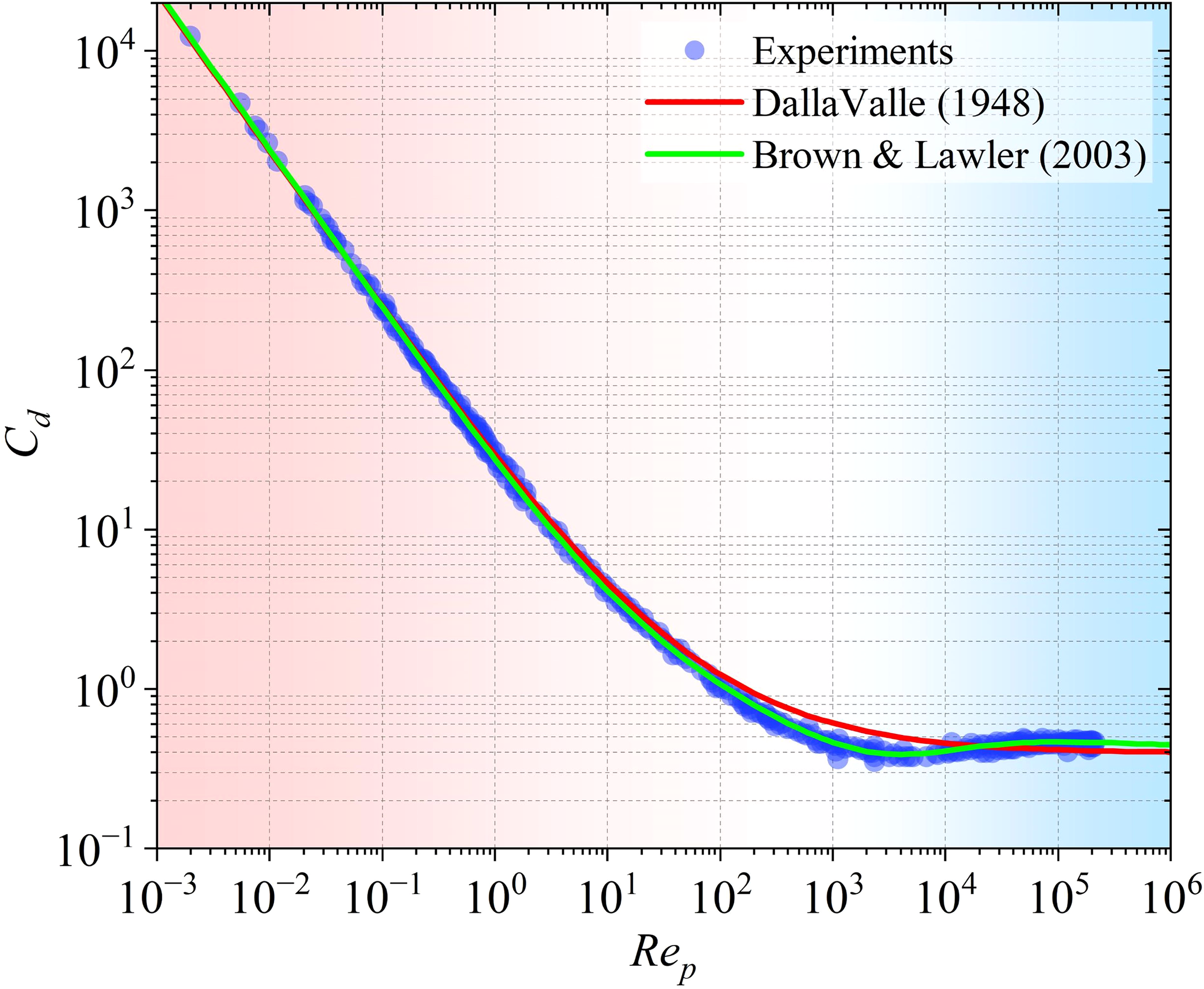 The Di Felice drag model is always used with the drag force coefficient (Cd) given by Dallavalle (1948) in previous studies (Jing et al., 2019; Nian et al., 2021b). In the present study, Cd is replaced by the drag force coefficient proposed by Brown and Lawler (2003) due to it having a wider scope of application and higher accuracy (Zhao et al., 2014). Figure 3 depicts the difference between the drag force coefficients proposed by Dallavalle (1948) and Brown and Lawler (2003), respectively. By referring to Zhao et al. (2014), the drag force coefficient proposed by Brown and Lawler (2003) shows a better agreement with the experimental data, especially in the range of 102-105 of particle Reynolds numbers. The drag force coefficient Cd is thus given as follows: