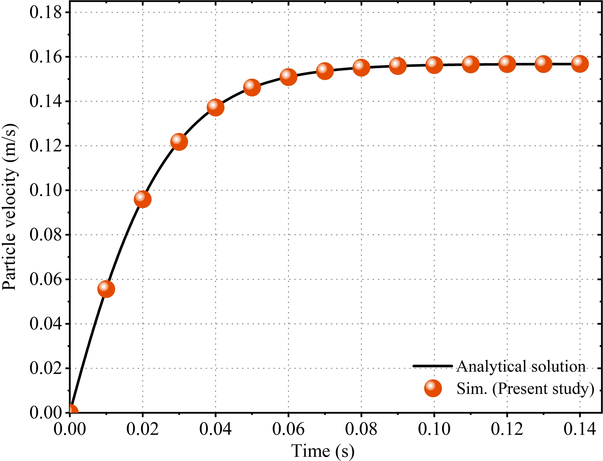The calculated particle settling velocity of the CFD-DEM simulation is compared with that of the analytical one, as shown in Figure 4. Clearly, the simulated settling velocity agrees well with that given by the analytical solution, which validates the proposed CFD-DEM scheme and the drag force model.