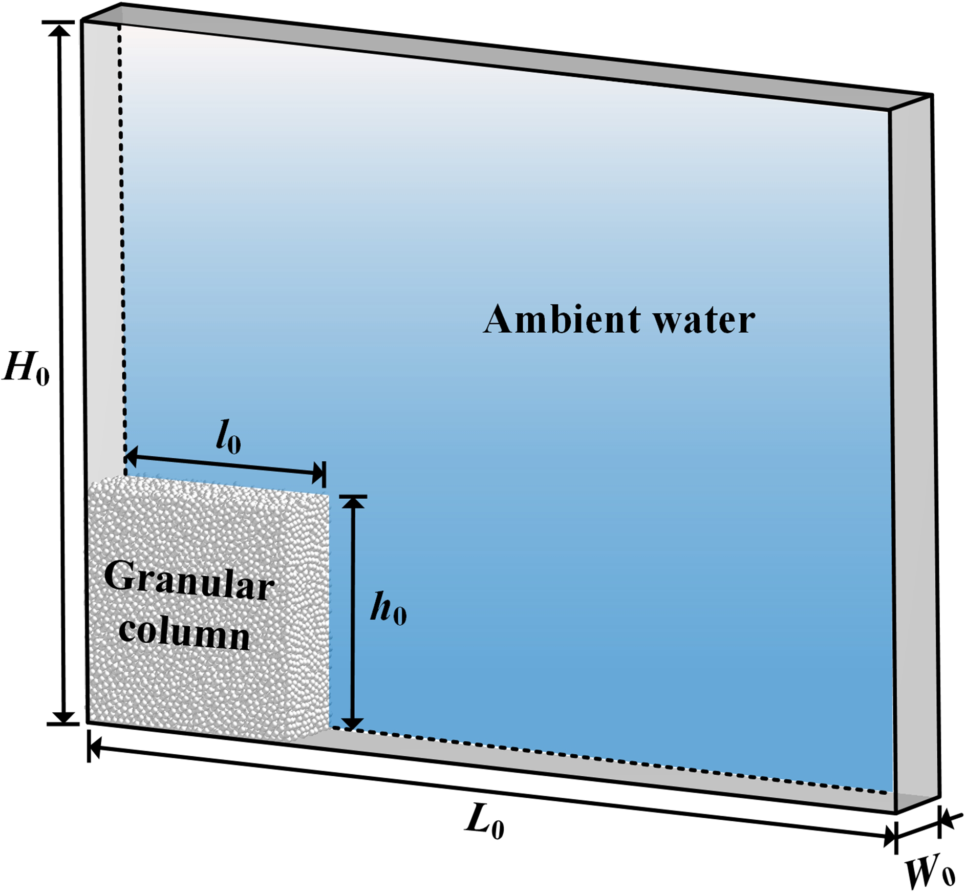 In the previous section, we gave an accurate prediction of the single-particle velocity by comparing it to the analytical results. However, multi-particle systems are more common and more important in the real world, one of which is submarine landslides (Guo et al., 2023b; Zhang et al., 2023). Submarine landslides can generate enormous turbidity currents with large amounts of sediment (Nisbet and Piper, 1998; Guo et al., 2022). These two marine geological disasters are essentially two types of immersed granular flow characterized by different particle volume concentrations. In the present study, we simulate the collapse and flow process of a granular column immersed in the ambient water through the CFD-DEM model and compare the results with the laboratory experiments conducted by Bougouin and Lacaze (2018). The motivation of this section is to verify the model rationality in simulating a real experiment, both in temporal and spatial scales. The immersed granular column in a laboratory scale is regarded as an idealized model of submarine landslides (or debris flow) and represents a class of high-concentration particulate flow. Because turbidity currents have a high sediment concentration in their near-bed regions, modeling of immersed granular collapse also has significance for simulating the turbidity current propagation.