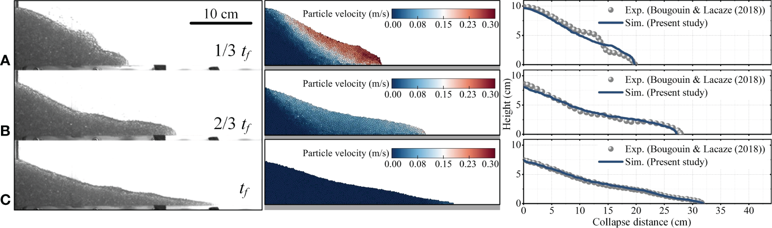 The time evolution of granular column collapse, both of experiments and numerical simulations, are shown in Figure 6, where the insets indicate the velocity field of the collapsed particles. According to the results, the granular column gradually collapsed into the ambient water with a waveform forming on the granular surface and a relatively thick front. In Figure 6A, the numerical result does not seem to be sufficiently accurate compared to the experiment data, which may result from the influence of sluice gate lifting. In the experimental videos provided by Bougouin and Lacaze (2018), the gate lifting process lasted approximately 0.33 s, which causes a disturbance of ambient water, and subsequently affects the initial motion of the side particles of the granular column. Fortunately, such influence is diminished over time according to the experiment results. At the final moment, the collapsed particles of the physical experiment and the numerical simulation are almost the same morphologically (see Figure 6C). In summary, our simulations accurately reproduce the multi-particle motions within the fluid both in temporal and spatial scales.