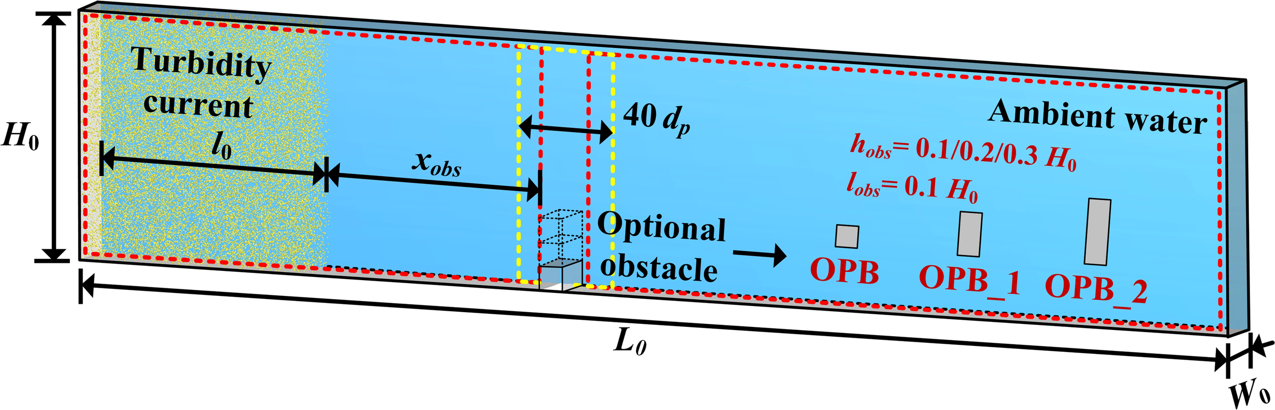 Schematic drawing of the computational set-up of turbidity current propagation, where L0 = 1000 dp, H0 = l0 = 200 dp, and W0 = 40 dp. In the configuration of the obstacle case, the optional obstacle has a distance xobs = 200 dp from the fixed volume of the particle-water mixture, and different rectangular sections.