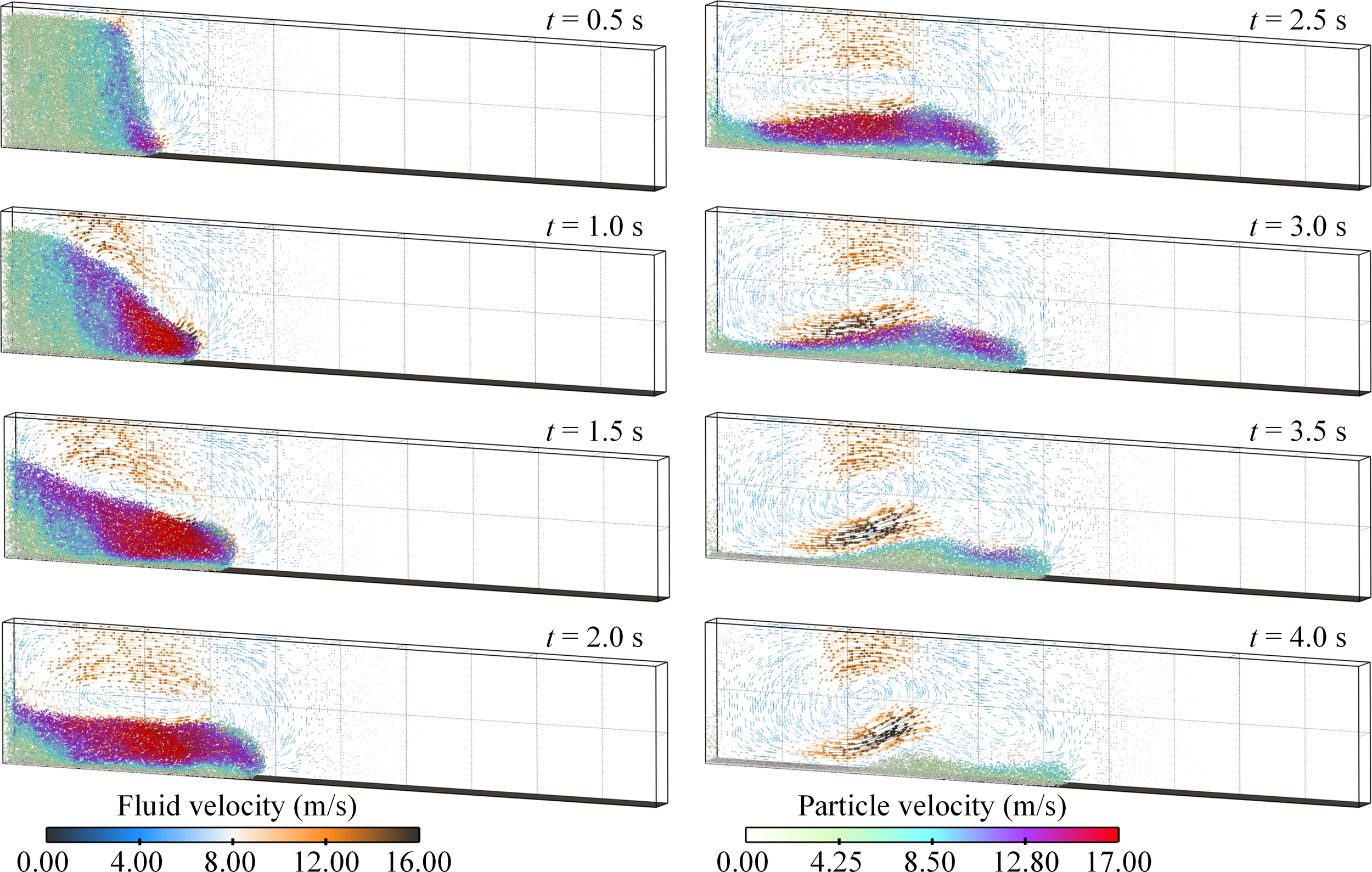 In the present study, the FB case is treated as a base case for analyzing the dynamics of the sediment particles and the ambient fluid. Figure 8 shows the time evolution of the particle-fluid velocity field from 0.5 s to 4.0 s, where the particles are visualized as balls with a diameter twice the original diameter. At the initial stage of turbidity current propagation, the upper part and lower part of the right side of the particle-water mixture indicate two high fluid-velocity areas in the opposite direction, making an approximately rotating flow field. As indicated by Xie et al. (2022), this phenomenon is caused by the reason that the ambient fluid invades into the particles in the upper part and the particles in the lower part are driven by the flow. Subsequently, the flow head of the turbidity current is gradually formed with a high-velocity core in the head, and the high-velocity core moves backward or even separated into two parts over time due to the drag of the ambient fluid (see 2.5 s and 3.0 s in Figure 8). Consequently, a convex-shaped surface gradually forms, which is similar to the erosion surface of the loosely packed particles after the immersed granular collapse in the study of Jing et al. (2018). These two phenomena are both caused by the vortex-induced fluid shear, indicating that the shape evolution of the particulate flow is highly related to the flow field of the ambient fluid. Specifically in this simulation, the rotating flow drives the particles of the flow tail to move forward but the particles in front of the tail hinder the advance of the rear particles, which leads to the flow tail becoming thinner and the flow body becomes thicker, and several vortices form in the whole channel. Moreover, the numerical results, especially the flow front position xf, are compared with a classic lock-exchange experiment of turbidity current propagation conducted by Gladstone et al. (1998). By referring to the previous studies (Nasr-Azadani and Meiburg, 2014; Xie et al., 2022), we used the buoyancy velocity ub and the half-height of the channel H0/2 as characteristic quantities for scaling the flow variables. The buoyancy velocity can be written as: