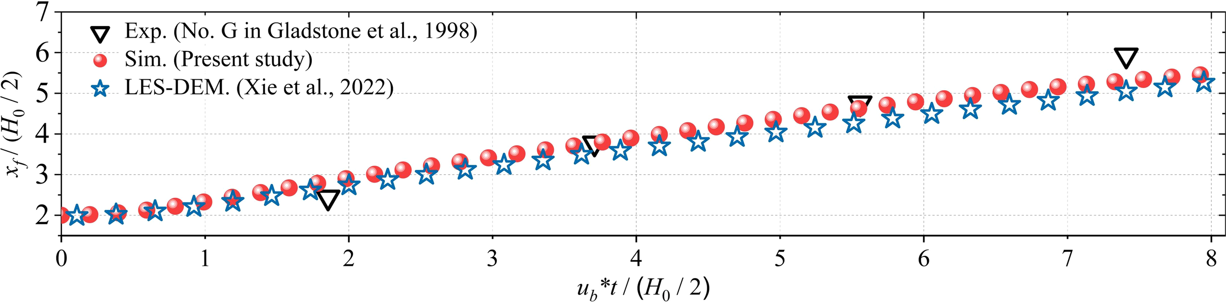 The numerical results of the dimensionless front position of turbidity current show good consistency with the experimental results as well as the LES-DEM simulation results from Xie et al. (2022), indicating the simulation is accurate (see Figure 9).