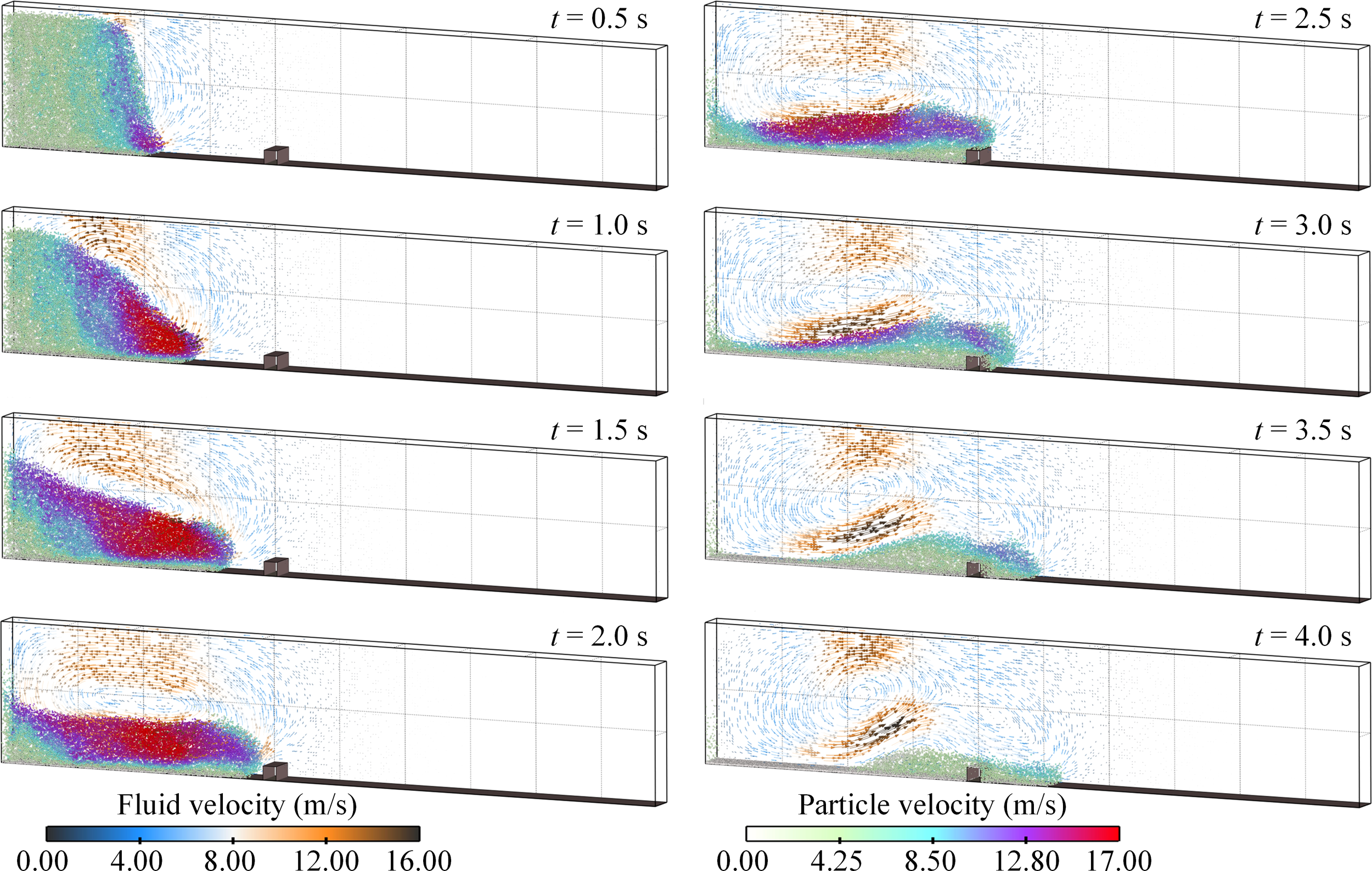 In the OPB case, the flow characteristics of turbidity current are almost the same as those in the FB case in the first two seconds except that the fluid velocity of the flow front is larger in the OPB case at 2.0 s (see the velocity vector arrows in Figure 10). Owing to the presence of the simplified obstacle, the fluid and particles have a trend of moving upward, and the flow front gradually becomes thicker. Obviously, the particle velocity of the flow front in the OPB case decreases when it encounters the obstacle. In general, there is no large difference in the flow field developments between both two cases due to the obstacle being relatively small in dimension.