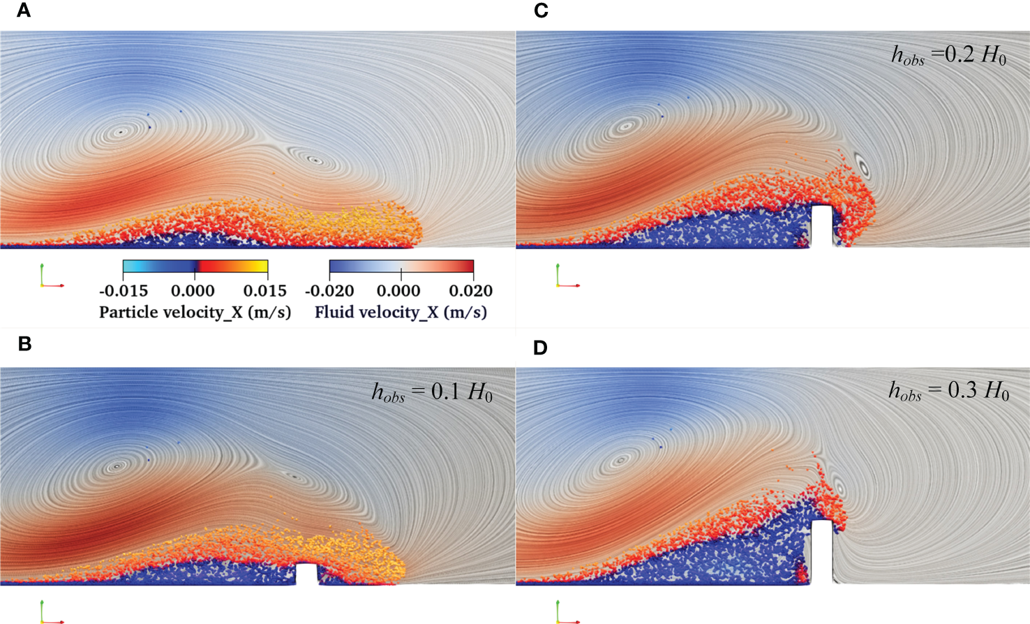 Snapshots of turbidity current propagation over (A) a flat bed, and three obstacle-placed beds with different obstacle heights, specifically, which are (B)hobs = 0.1 H0, (C)hobs = 0.2 H0, and (D)hobs = 0.3 H0. The color maps indicate the particle velocity (balls) and fluid velocity (streamlines) in the x-direction.