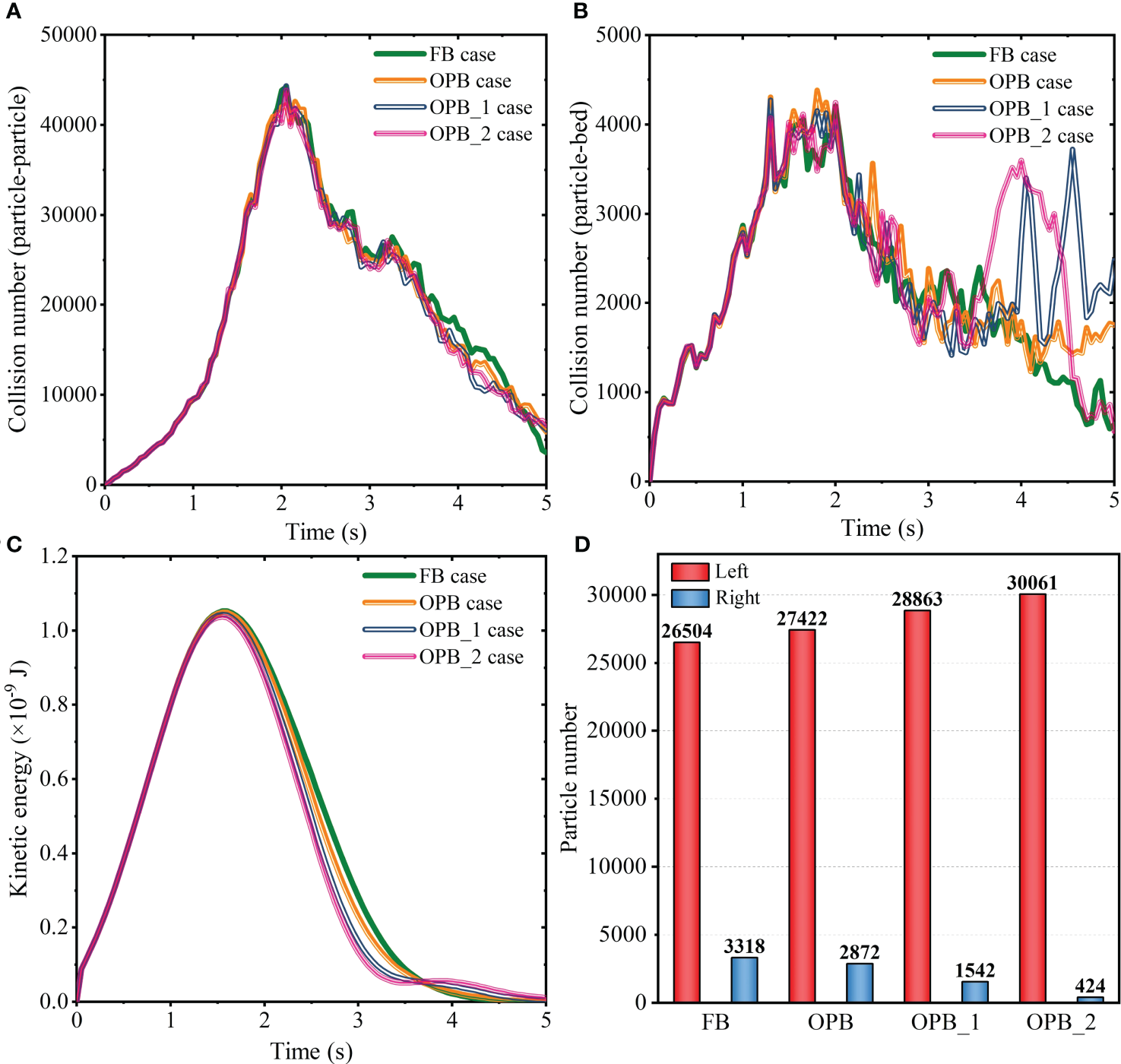 Time evolution of (A) inter-particle collision number, (B) particle-bed collision number, (C) kinetic energy, and (D) particle sedimentation number in the channels of FB and OPB-type cases.