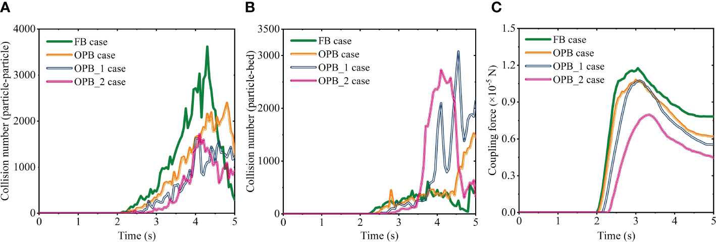Time evolution of (A) inter-particle collision number, (B) particle-bed collision number, and (C) coupling force in the adjacent area around the obstacle of FB and OPB-type cases.