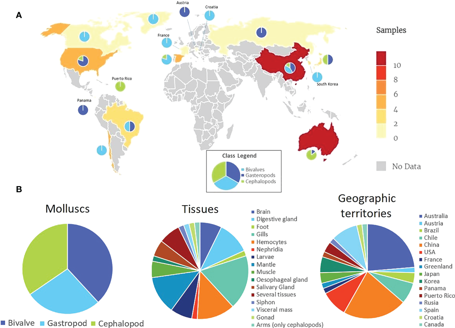 (A) Geographical distribution of samples analyzed in this virome study. The data legend indicates the number of SRA datasets studied. Circular graphs show the number of analyzed gastropods, bivalves and cephalopods from each geographic territory. (B) Summary of analyzed data.