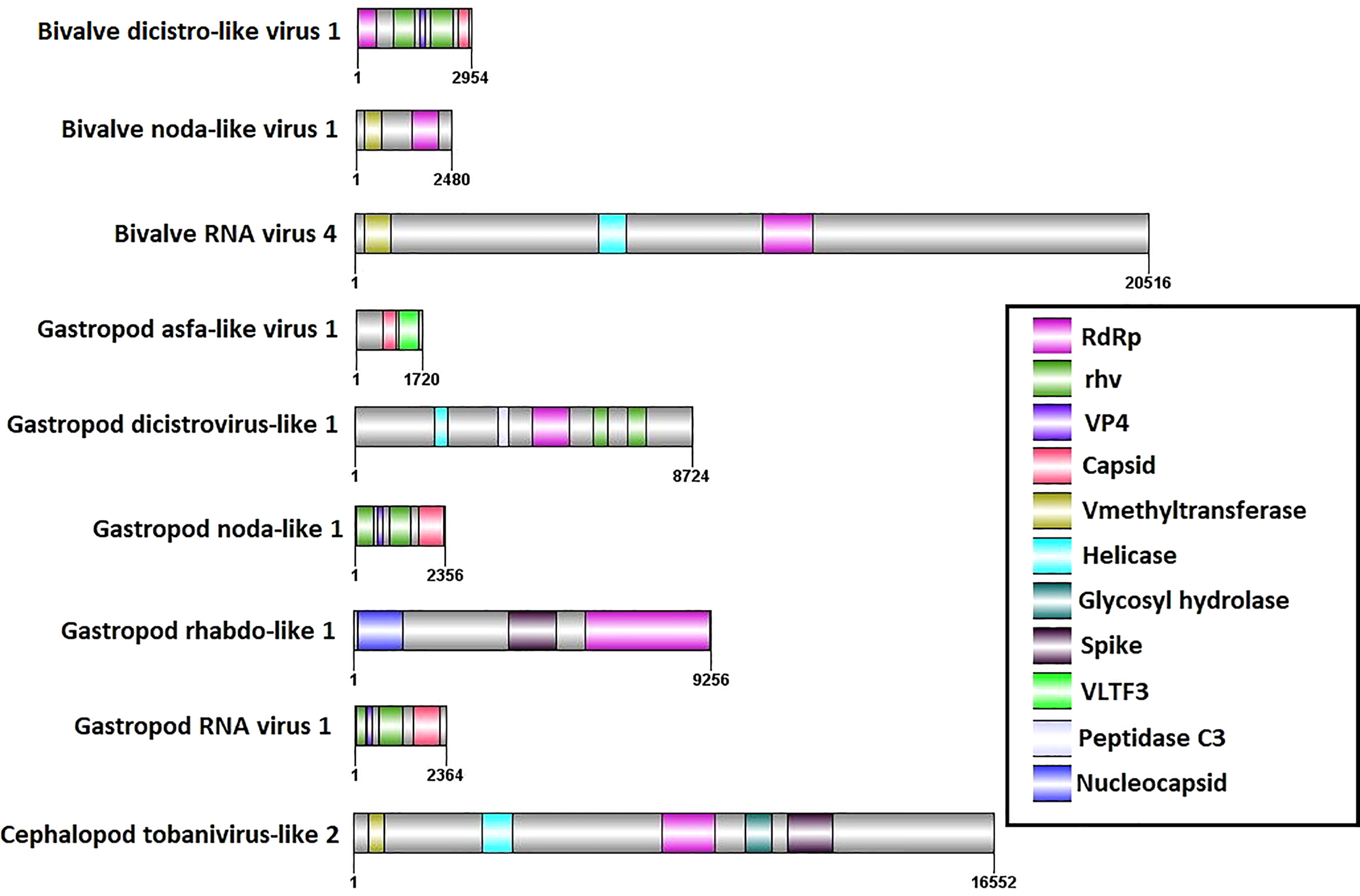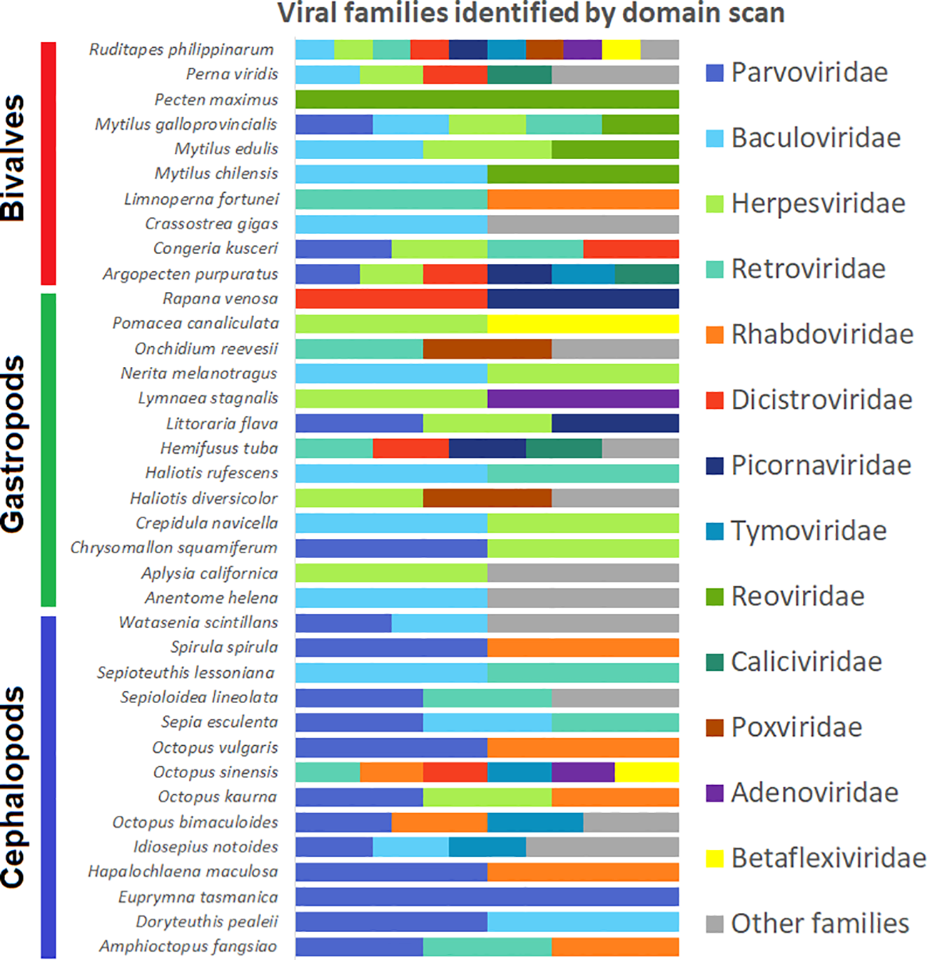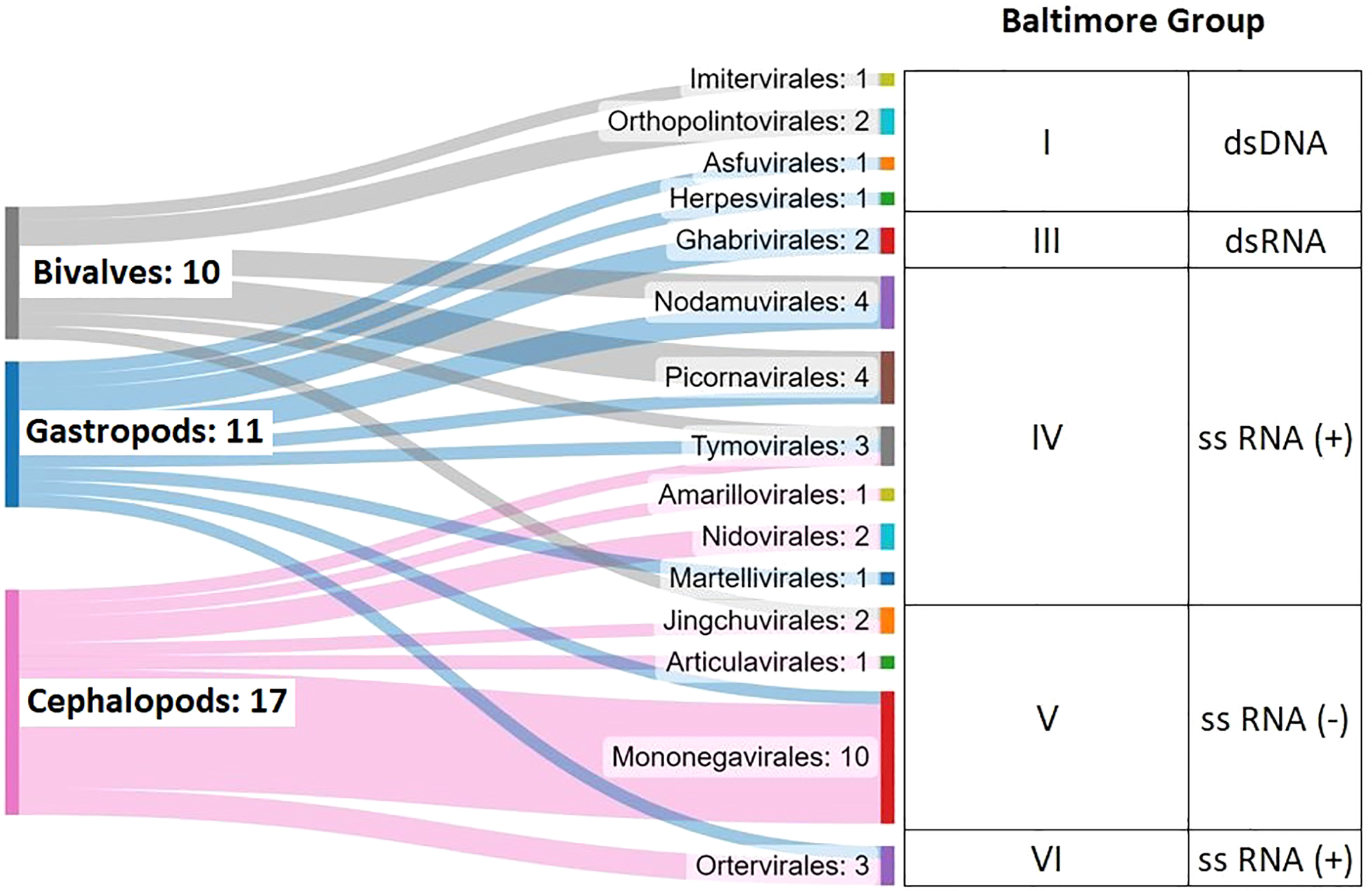 Twenty-two bivalves, 19 cephalopods and 16 gastropods from 16 geographical origins and 17 different tissues were considered. The domain search approach was the most productive method to find viral sequences. This virus search showed that Cephalopoda samples (Idiosepius notoides and Amphioctopus fangsiao) exhibited the highest number of virus identifications. Some of the detected viral sequences were similar or identical to others previously identified. However, 33 putative new viruses were identified and analyzed phylogenetically when the RdRp domain was available. Specifically, Cephalopoda samples showed a considerable number of viruses belonging to the Rhabdoviridae family.