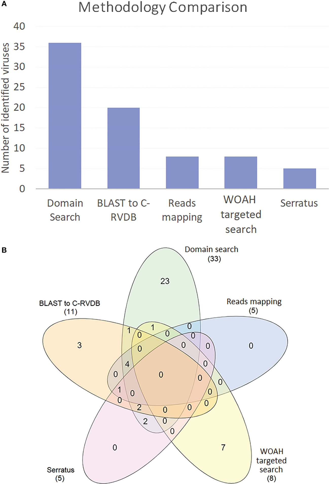(A) Comparison of all the methods used in this work to find viral sequences in 55 SRA and 7 TSA-NCBI files. (B) Venn diagram showing shared and exclusive viruses identified by each method.