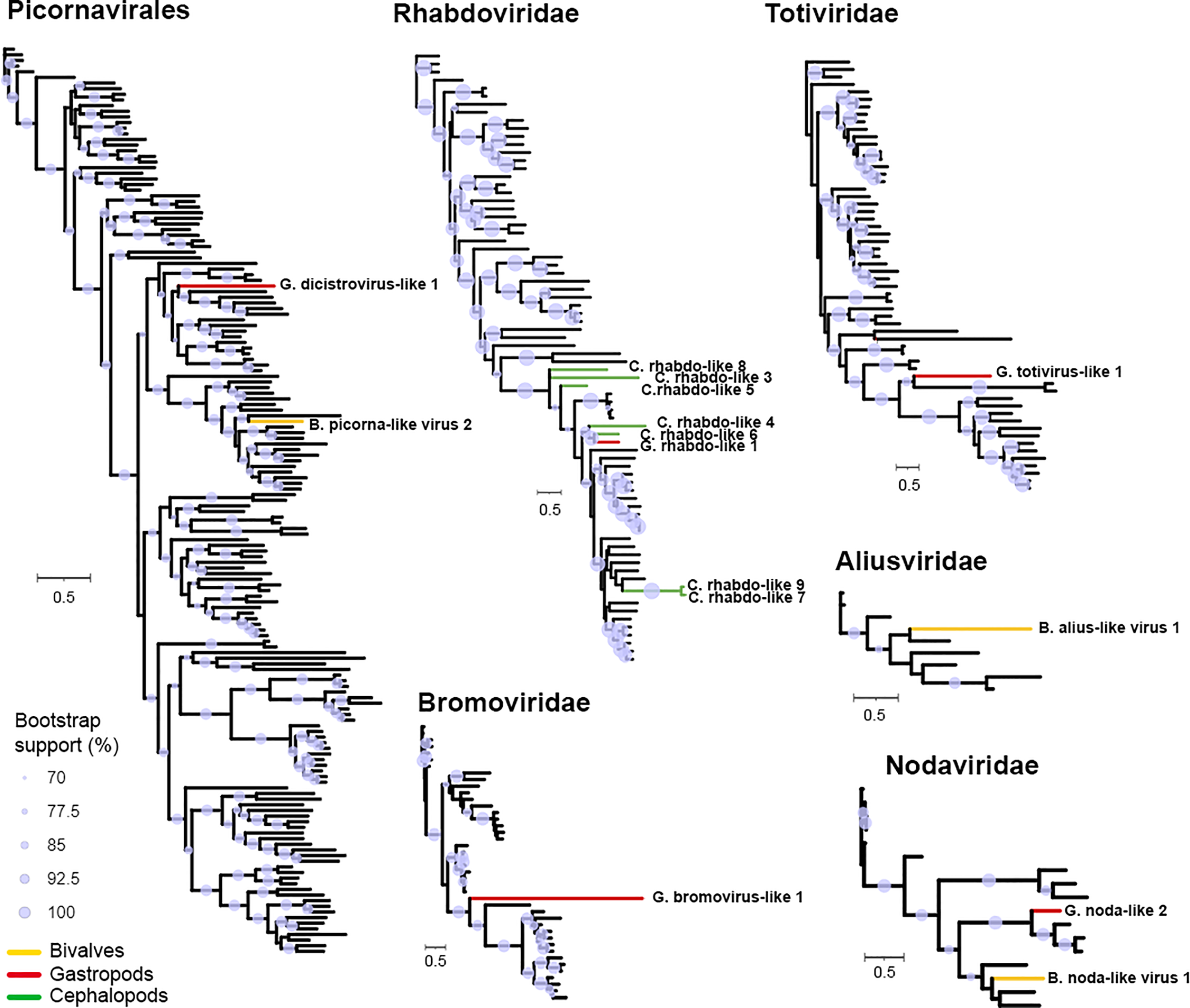 In the third group, 33 different putative new viruses belonging to 14 families were found in the mollusk transcriptomes (Table 2) and named according to their putative classification (sequences in the Supplementary Table 6). In bivalves, viral sequences similar to viruses belonging to the families Aliusviridae (Bivalve alius-like virus 1), Dicistroviridae (Bivalve dicistro-like virus 1), Nodaviridae (Bivalve noda-like virus 1-2) and Picornaviridae (Bivalve picorna-like virus 1-2) were identified. Moreover, 4 yet unclassified viruses (Bivalve RNA virus 1-4) were detected in different species.